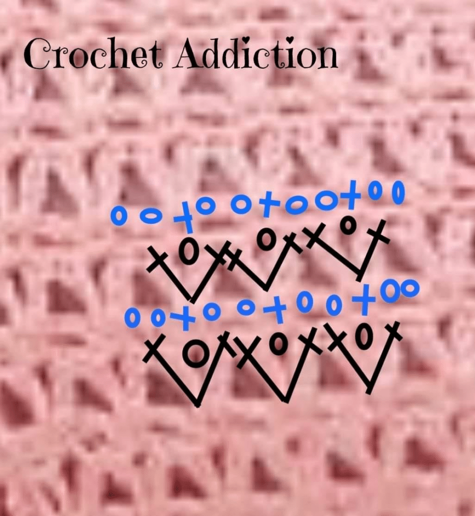 - Ponto alto (p. a.): Laçe, introduza a agulha, laçe, puxe o ponto, laçe, remova 2 pontos e com outra laçada, remova todos os pontos.