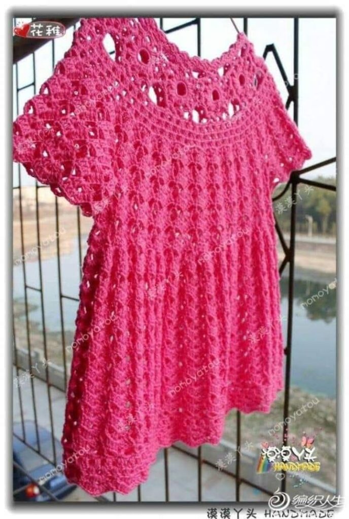 - Finalize com um bico de acabamento ao redor do decote, cavas e barra, utilizando o ponto caranguejo.