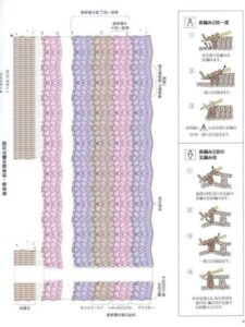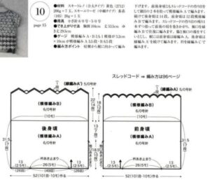 - Aos 35 cm de comprimento, separe frente e costas e trabalhe em carreiras de ida e volta no ponto fantasia (B), seguindo o diagrama 2.