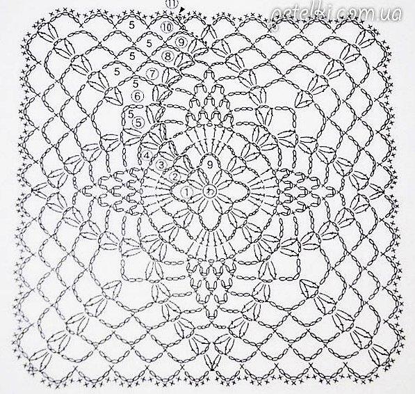 - 36 – Barra, inicie na cava, na carreira de 5 correntinhas ao lado do leque do square da cava. Faça 3 correntinhas, vá na artola de 5 correntinhas do lado e faça um leque com 3 pontos altos, 2 correntinhas, 3 pontos altos;