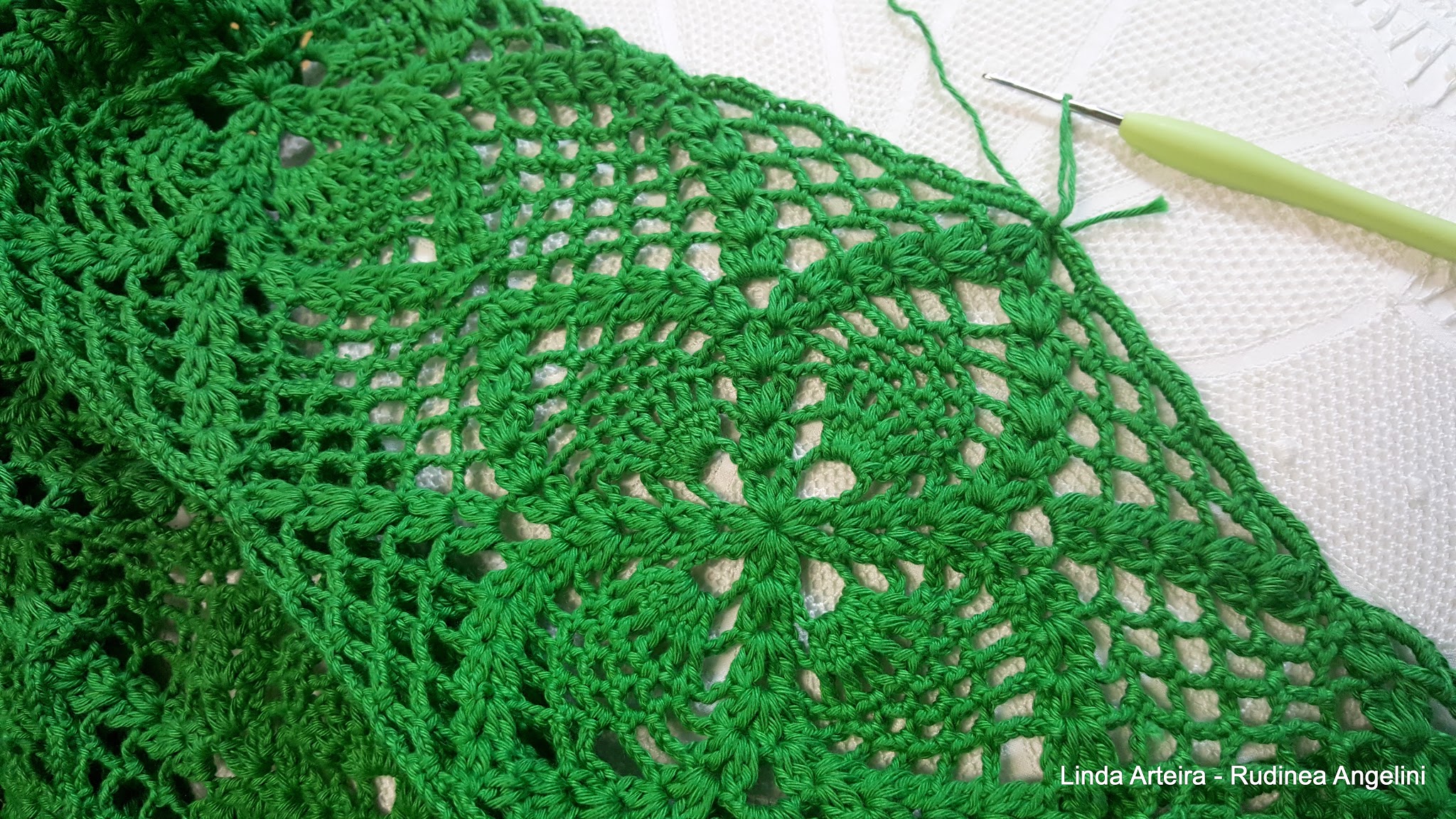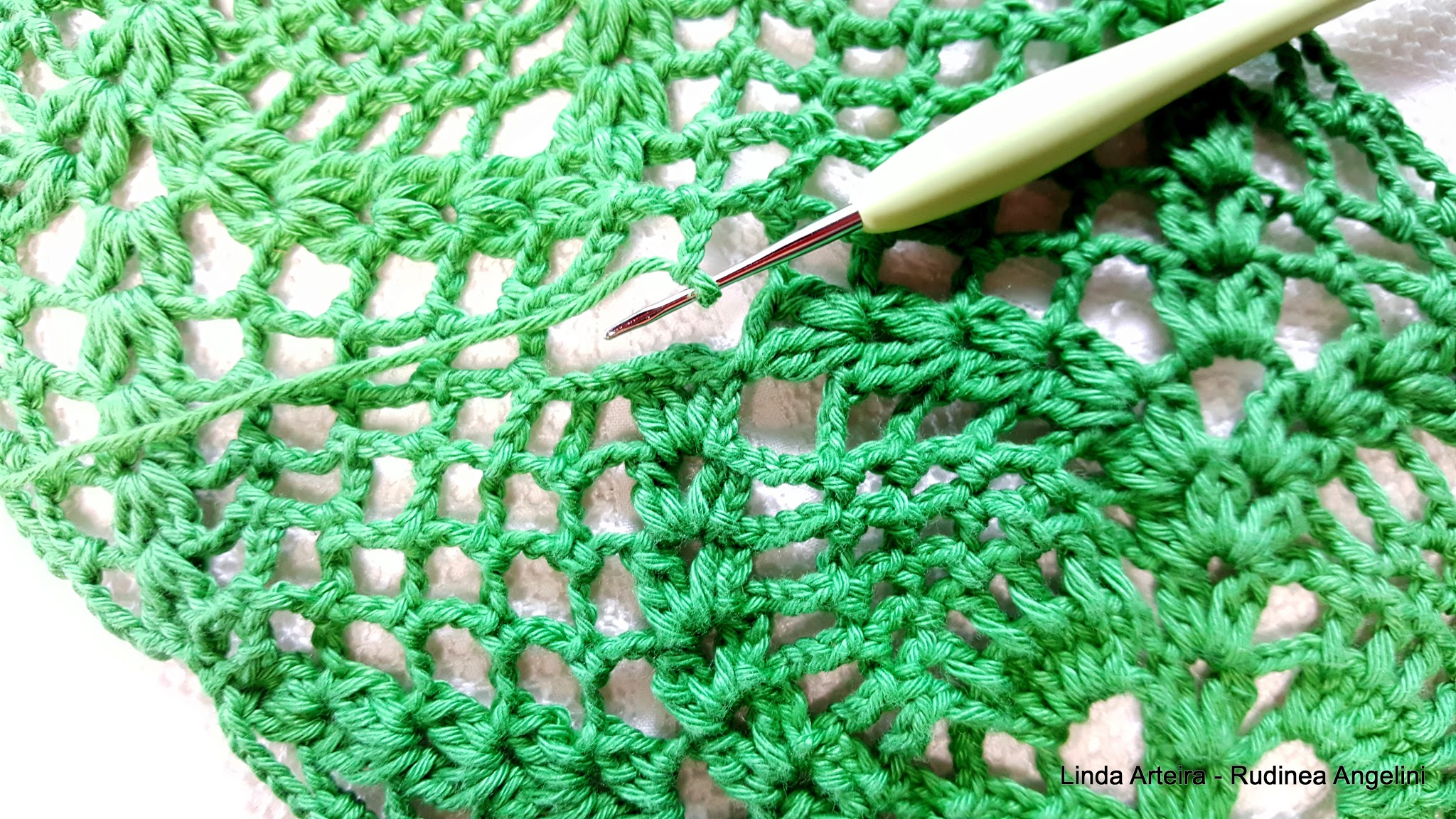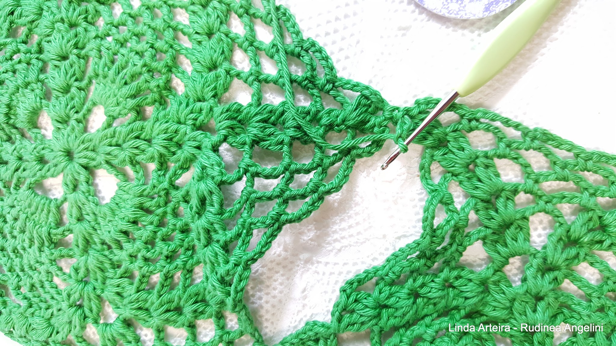 - 21 – Siga fazendo 2 correntinhas, vá no square de baixo faça 1 ponto baixo, faça 2 correntinhas, vá no square de cima, siga esta sequência até os dois leques do meio da carreira. Chegando nos 2 leques, faça os últimos 4 pontos altos que são fechados em um ponto só;