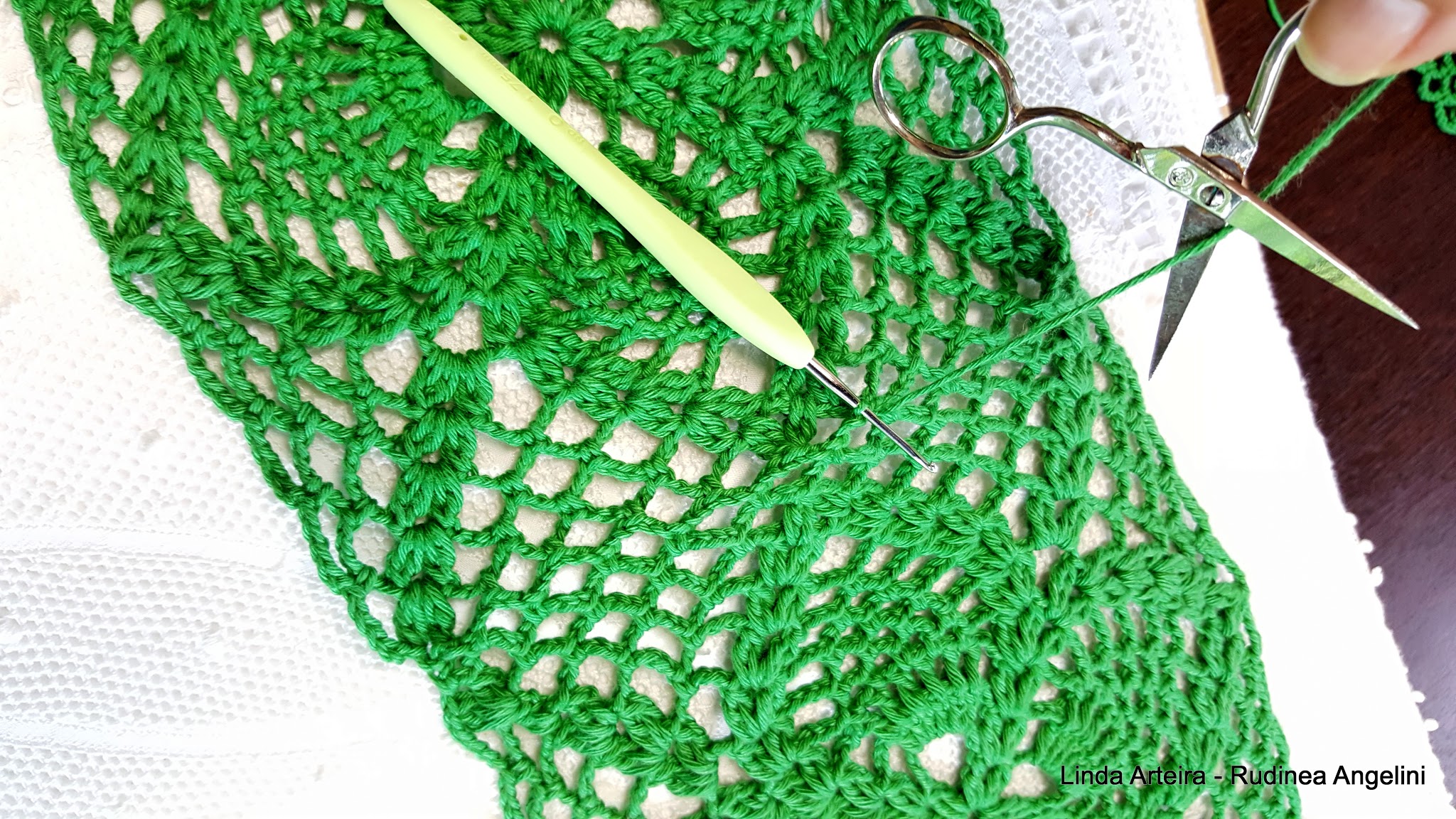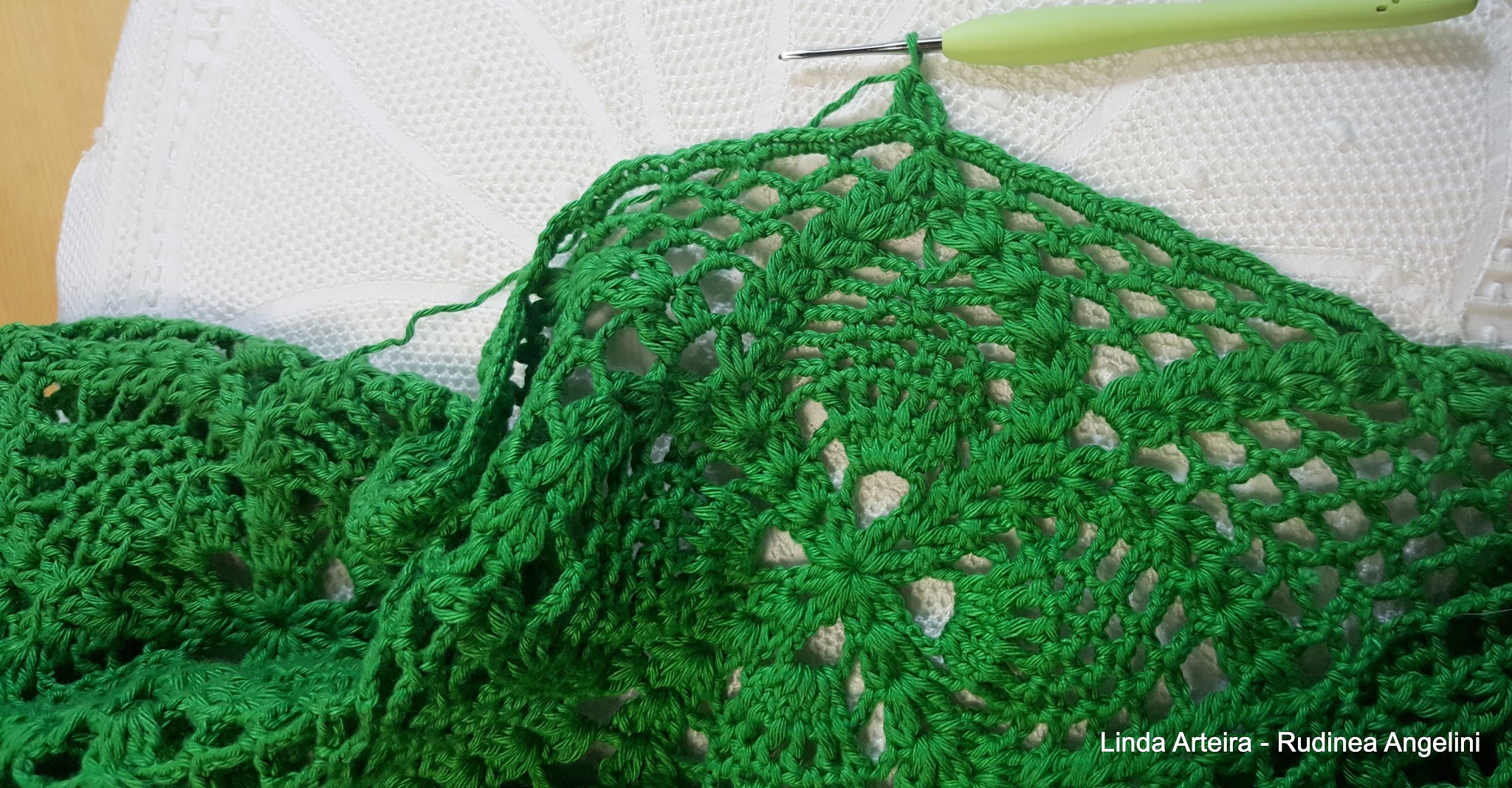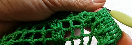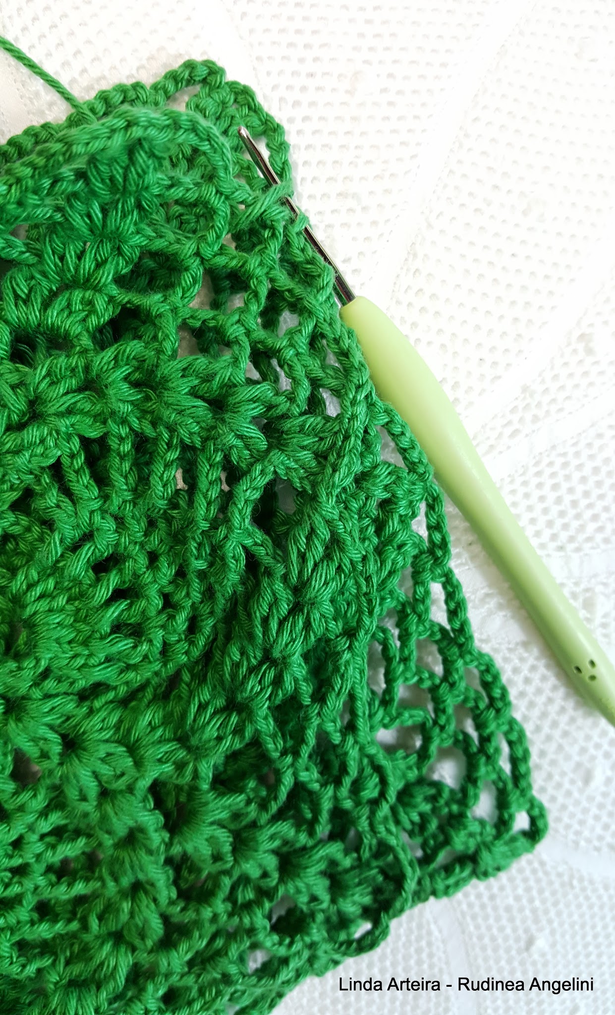 - 21 – Siga fazendo 2 correntinhas, vá no square de baixo faça 1 ponto baixo, faça 2 correntinhas, vá no square de cima, siga esta sequência até os dois leques do meio da carreira. Chegando nos 2 leques, faça os últimos 4 pontos altos que são fechados em um ponto só;