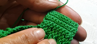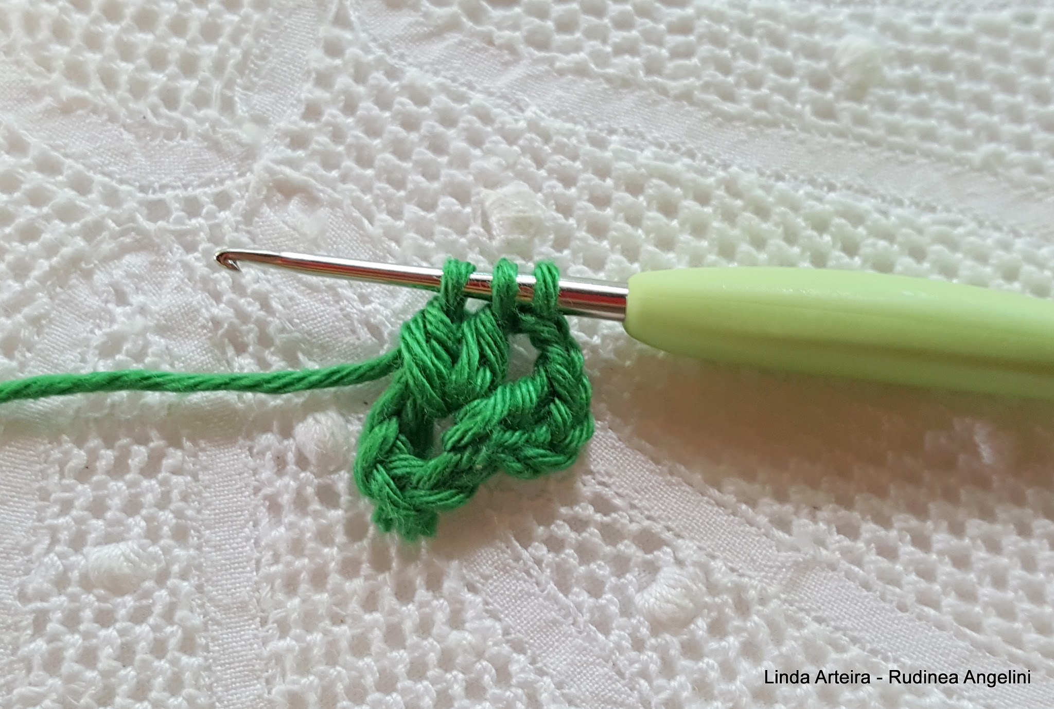 - 02- Faça 1 ponto alto, tire meio ponto, faça outro ponto alto, tire meio ponto e a seguir tire todos da agulha fechando os dois pontos altos juntos , suba 9 correntinhas ;