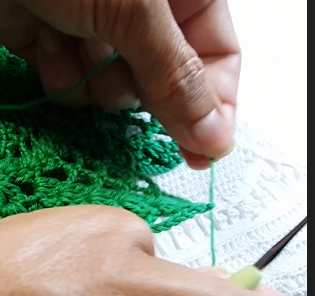 - 24 – Para unir o último square, colocar o fio dentro das 2 correntinhas do leque, dar um nó, posicionar a agulha dentro das 2 correntinhas do loque de cima e dentro do leque de baixo, faça um ponto baixo;