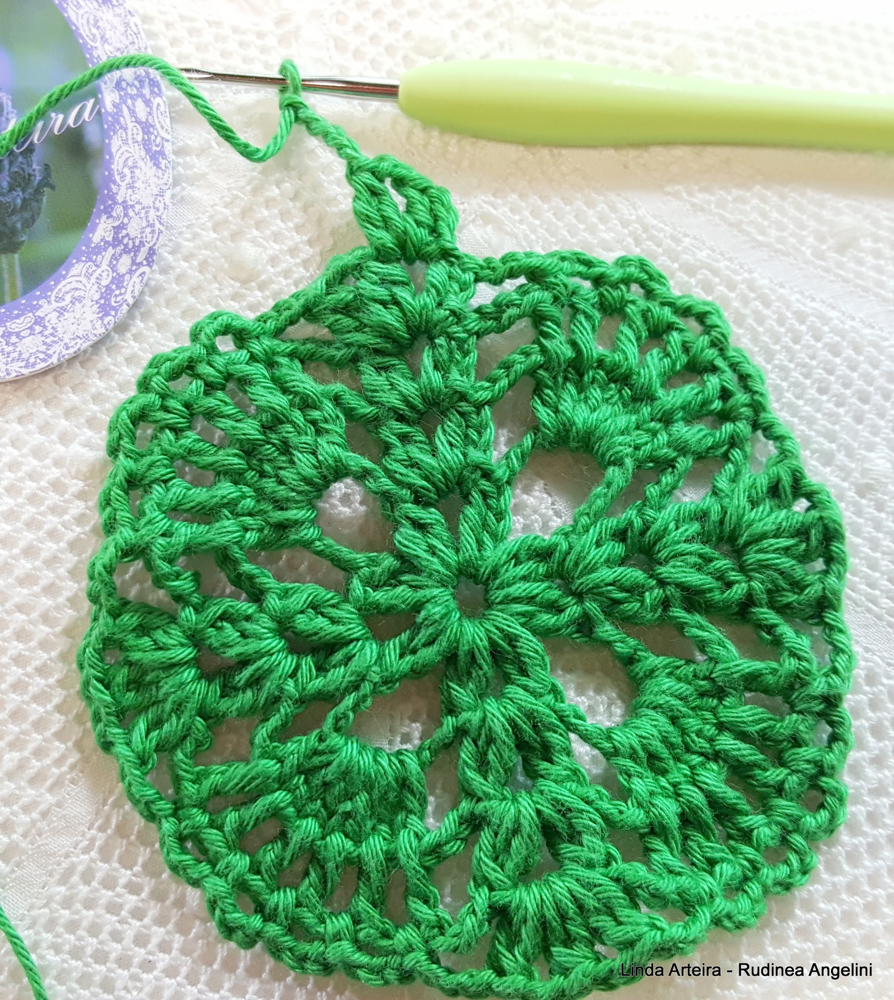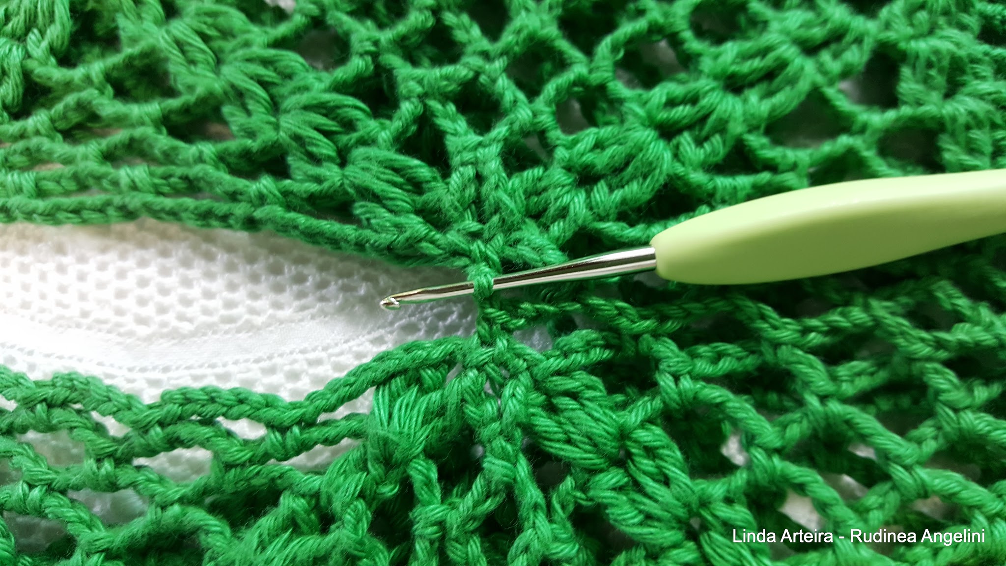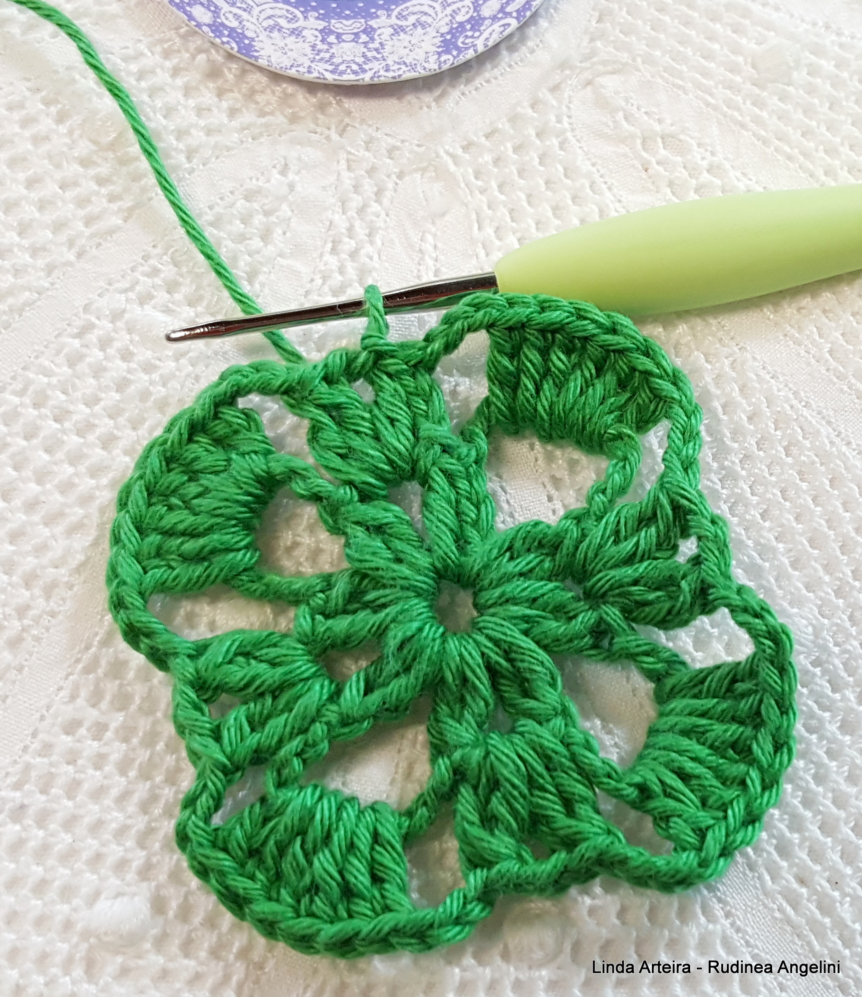 - 22 – Feche a volta fazendo um ponto baixíssimo em cima do último ponto baixíssimo que foi feito dentro do espaço de 5 correntinhas na carreira anterior ;