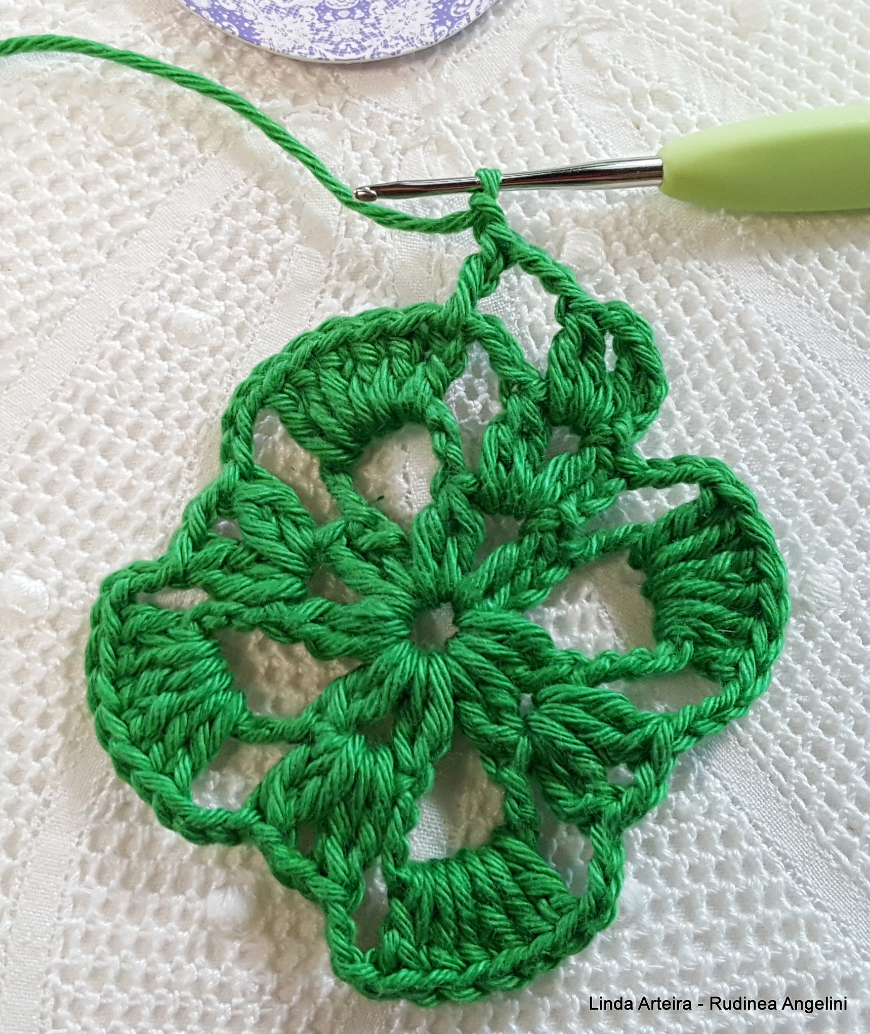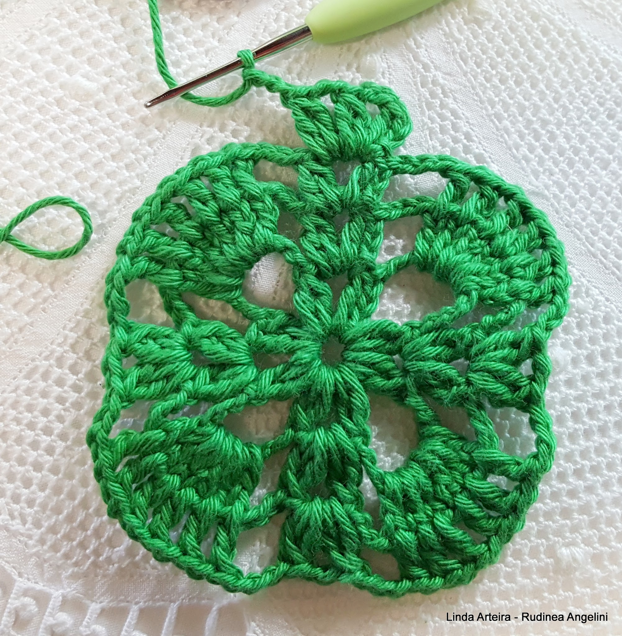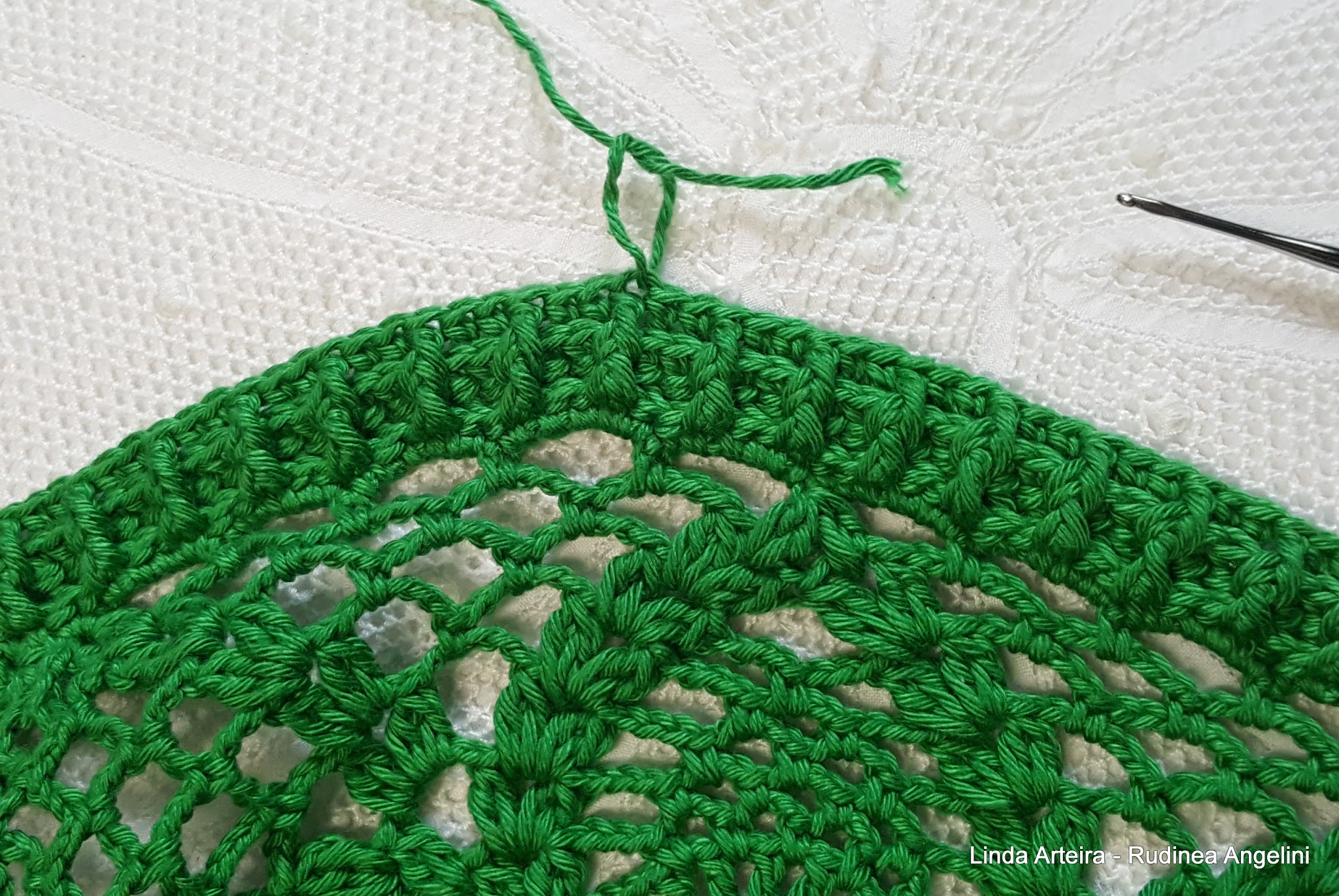 - 22 – Feche a volta fazendo um ponto baixíssimo em cima do último ponto baixíssimo que foi feito dentro do espaço de 5 correntinhas na carreira anterior ;