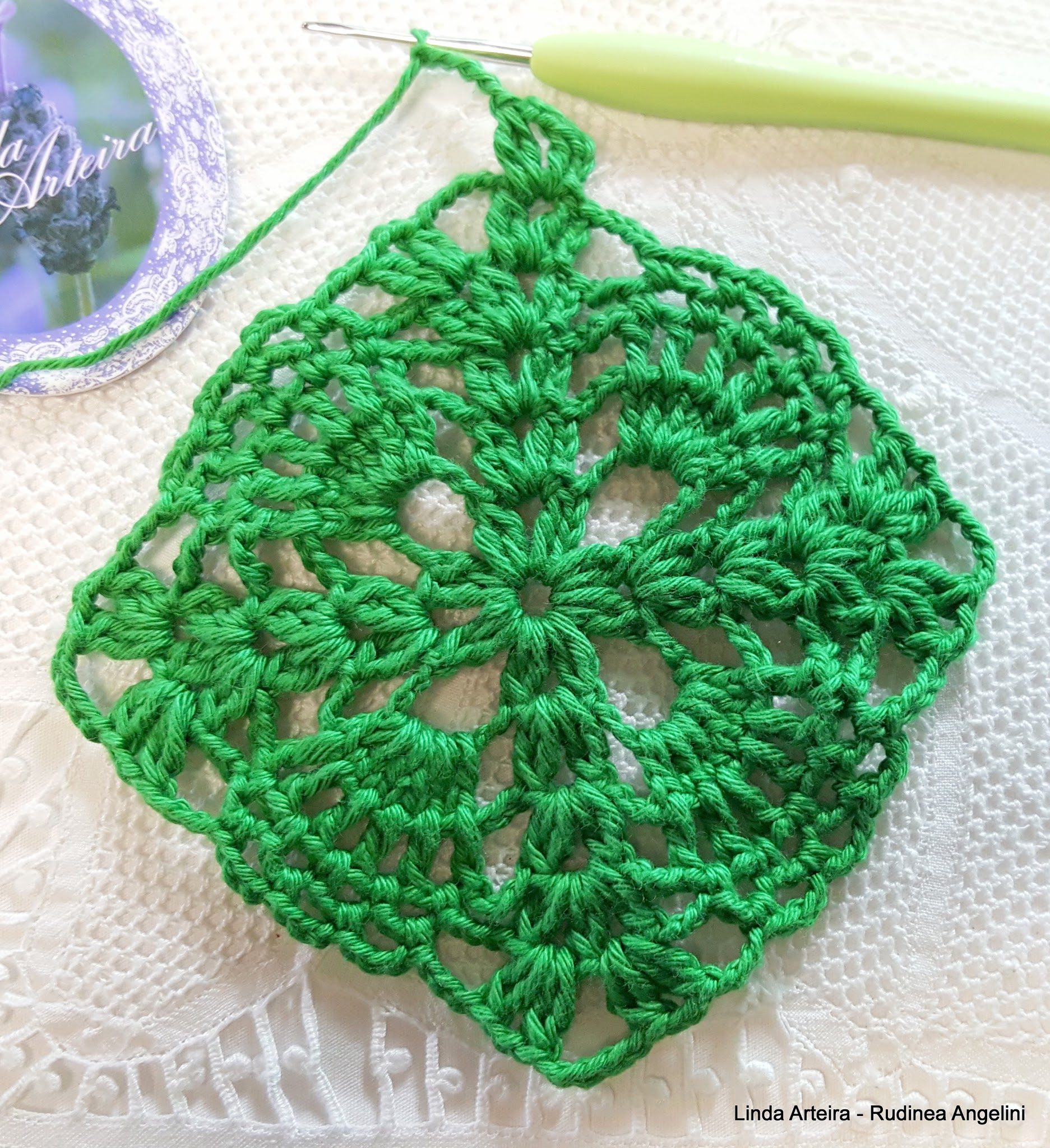 - 11 – Feche a 7ª carreira, inicie a próxima carreira, esta ficará com 3 espaços de 5 correntinhas 1 leque, mais 3 espaços de 5 correntinhas nas 4 laterais, siga a carreira toda desta forma ;