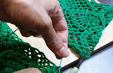 - 15 – Faça 2 correntinhas para começar a unir um square no outro nesta penúltima carreira, para unir os squares, colocar lado avesso com lado avesso ;