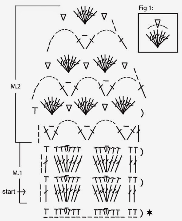 C 5 : 4 pc (= 1 pad), *7 pc, saltar 1 concha, 1 pad + 1 pc + 1 pad + 1 pc + 1 pad no pb entre 2 conchas * repetir de * a * e terminar com 7 pc, 1 pad + 1 pc + 1 pad + 1 pc no último pb e 1 pbx no 4.º pc do princípio da carreira.