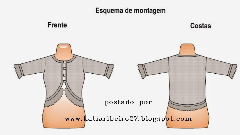 Manga – trabalhe a manga diretamente na cava, distribuindo uniformemente 10 motivos na borda da cava e fechando em círculo com 1 p.bx. Siga em carr. circulares por 9 carr. e arremate. Trabalhe a outra manga da mesma forma.