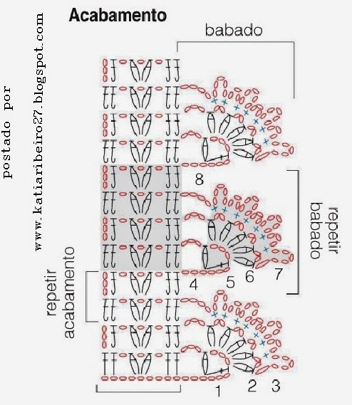 Acabamento: para o acabamento do decote – monte 9 corr., trabalhe 67 carr. no acabamento com babado e arremate. Prenda o acabamento no decote com pontinhos à mão, pelas pontas do babado, sobrepondo aprox. 1 cm das pontas do babado por cima do decote.