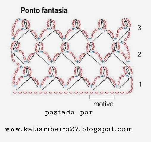 Como fazer: costas – monte 63 corr. soltas e trabalhe no p. fantasia, executando 13 motivos na 1ª carr. Siga reto por 15 carr. A essa altura, não trabalhe os 5 motivos centrais para o decote e termine cada lado separadamente. Siga com os motivos de cada lado por mais 3 carr. e arremate Termine o outro ombro da mesma forma.