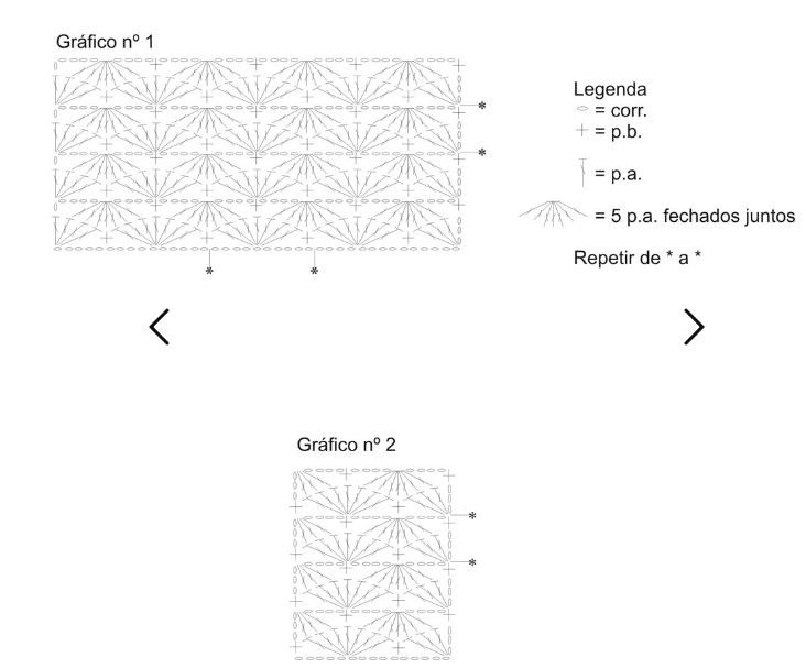 - Correntinha (corr.). Ponto baixo (p.b.): introduza a ag.,laç., puxe o p. e com outra laç., rem. todos os p.. Ponto alto (p.a.): laç., introduza a ag., laç., puxe o p. laç., rem., 2 p. e com outra laç., rem. todos os p.. Ponto fantasia: siga os gráficos 1 e 2. Esquema de montagem: siga o gráfico.