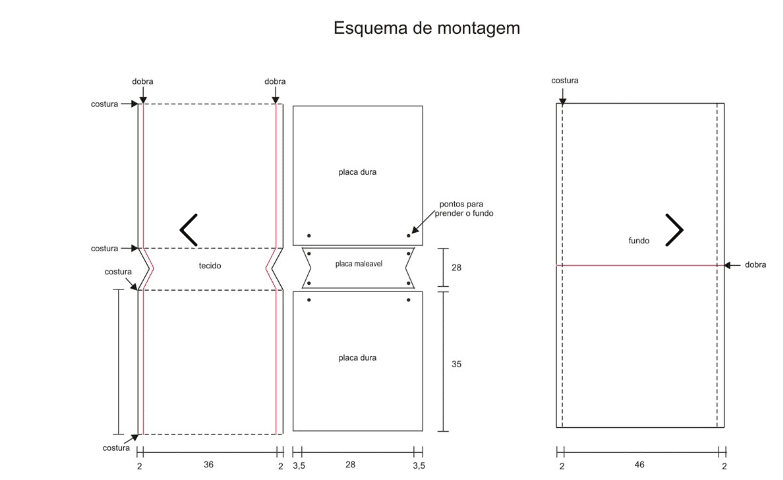Estrutura da bolsa – Corte o tecido nas medidas do esquema. Sobreponha as duas partes iguais e costure seguindo as indicações do esquema. Corte, as duas laterais menores da placa EVA.