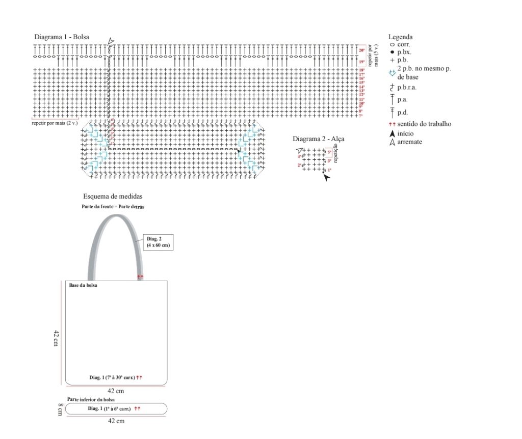 Corr.: correntinha, p.b.: ponto baixo, p.bx.: ponto baixissimo, 2 p.b. no mesmo p. de base: 2 pontos baixos juntos no mesmo ponto de base p.b.r.a.: p. baixo em relevo pegando por trás do p. da carr. anterior, p.a.: ponto alto, p.a.d.: ponto alto duplo, bolsa: siga o diag. 1, alça: siga o diag. 2.