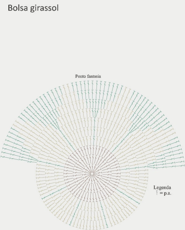 Bolsa – Primeiramente, com o fio marrom,faça uma corr. de 6 p. feche em círculo e trabalhe em p. fantasia seguindo o gráfico, após isso, siga as cores indicadas no gráfico. Então, terminado o gráfico rem.. Faça 2 partes iguais.