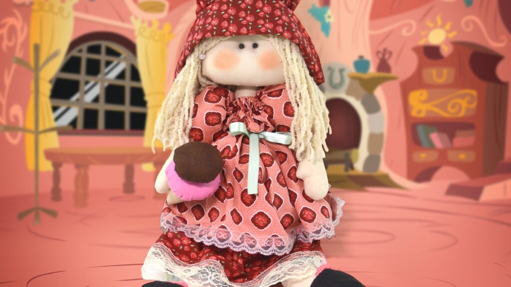 Aplique blush nas bochechas e confeccione um sorvete de tecido, prendendo-o na mão da boneca. Assim, a Boneca Valentina em patchwork fica pronta para encantar como uma peça única de artesanato e criatividade.