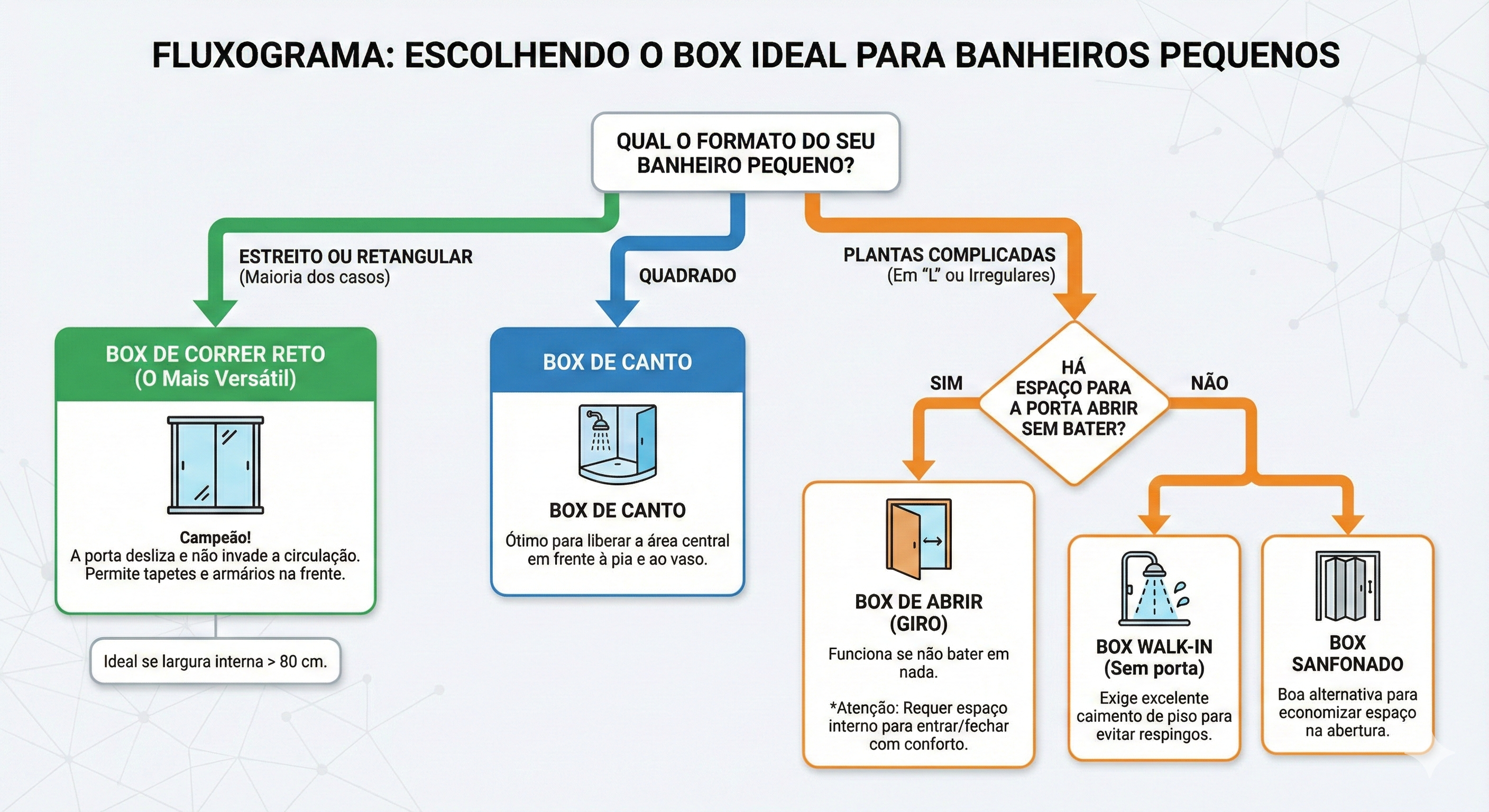 De forma geral, o box de correr é o mais versátil em banheiros pequenos porque não invade a circulação. A porta desliza sobre outra folha de vidro e você consegue colocar tapete, cesto de roupa ou um armário estreito sem bater na porta.