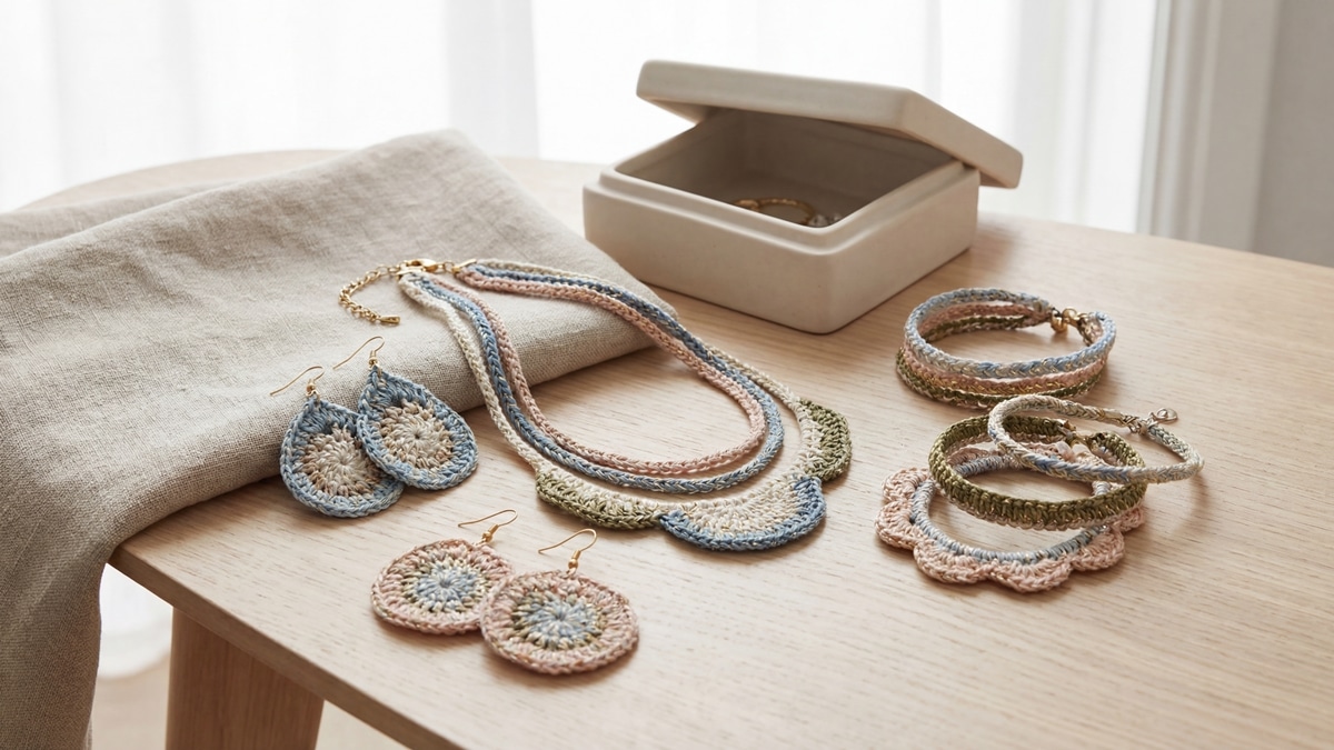 Os brincos, colares e pulseiras de crochê são excelentes produtos para quem quer começar ou ampliar um negócio de artesanato. São peças pequenas, rápidas de produzir e perfeitas para montar kits e coleções temáticas, como “coleção verão”, “coleção romântica” ou “coleção boho”.