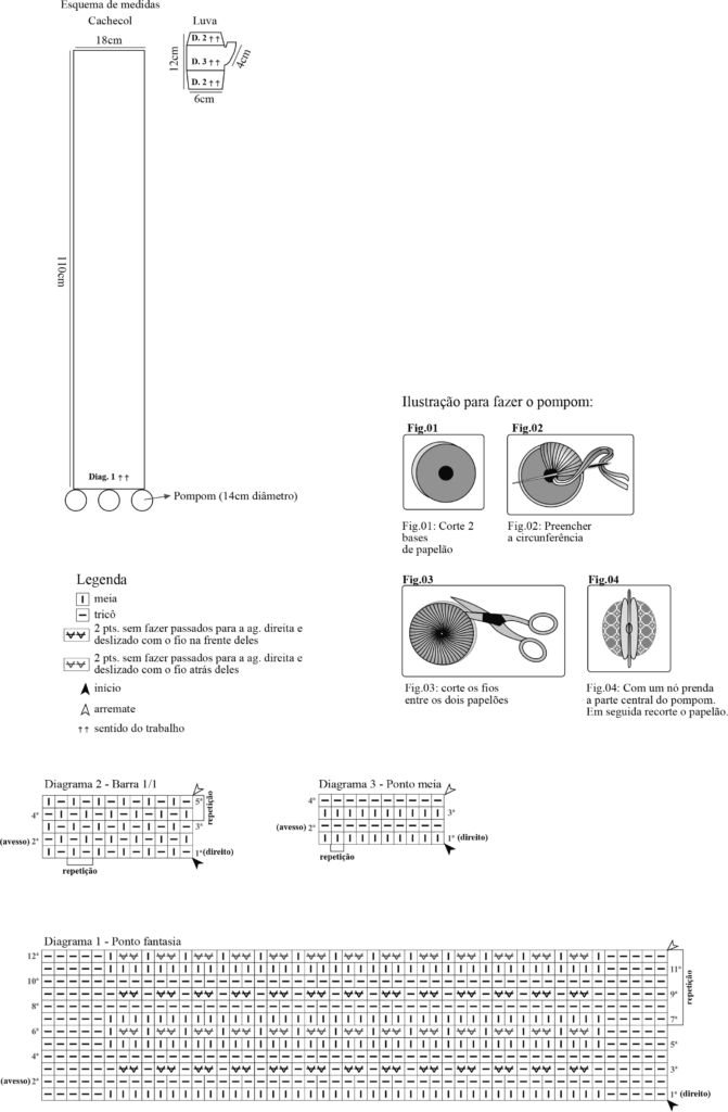 Abreviaturas: p.: ponto, pts.: pontos, rep.: repita, m.: meia, t.: tricô, tric.: tricote ou tricotando; carr.: carreira, ag.: agulha, aum.: aumentos ou aumentos, diag.: diagrama, trab.: trabalhando. Pontos utilizados no tricô: ponto fantasia: siga o diag. 1. Barra 1/1: siga o diag. 2; p. meia: siga o diag. 3, pompom: siga as ilustrações (fig. 1, 2, 3 e 4). Amostra – Um quadrado de 10cm em p. meia na ag. de 4,5mm = 22 pts. x 25 carr.. Execução: Transfira os moldes para o papel vegetal para usar como referência na execução da peça. Observe as setas no esquema de medidas com a indicação do sentido do trabalho. Cachecol: Inicie a peça pela parte inferior, use o fio ABC na cor amarelo e monte 50 pts. na ag. de 4,5mm, tric. a peça no p. fantasia acompanhando o diag. 1 e os pts. de rep.. À 110cm de comprimento desde o início arremate todos os pts.. Faça três pompons de 14cm de diâmetro cada e prenda na parte inferior da peça. Siga a ilustração para fazer os pompons. Luva (mão direita): Inicie a peça pelo punho, use o fio ABC na cor amarelo e monte 32 pts. na ag. de 4,5mm, tric. em p. de barra 1/1 acompanhando o diag. 2 e os pts. de rep. por 12 carr.. 13ª carr. (direito): 32 m.; 14ª carr. (avesso): 32 t.; Agora dê início aos aum. no centro da peça para formar encaixe do dedo polegar. 15ª carr.: 15 m.; 1 aum., 2 m., 1 aum., 15 m.; 16ª carr.: 34 t.; 17ª carr.: 15 m.; 1 aum., 4 m., 1 aum., 15 m.; 18ª carr.: 36 t.; 19ª carr.: 15 m.; 1 aum., 6 m., 1 aum., 15 m.; 20ª carr.: 38 t.; 21ª carr.: 15 m.; 1 aum., 8 m., 1 aum., 15 m.; 22ª carr.: 40 t.; 23ª carr.: 15 m.; reserve os 10 pts. centrais no alfinete para depois dar continuidade ao dedo polegar, 15 m.; 24ª carr.: 30 t.; Prossiga sobre os 30 pts. em p. de barra 1/1 acompanhando o diag. 2 e os pts. de rep. por 7 carr., a seguir arremate os pts., deixando uma sobra do fio de aproximadamente 25cm para fazer a costura. Transpasse este fio na ag. de tapeçaria e costure a lateral da peça. Retorne os 10 pts. reservados do alfinete e tric. em p. meia acompanhando o diag. 3 e o p. de rep. da 1ª até a 4ª carr., a seguir arremate os pts., a seguir arremate os pts., deixando uma sobra do fio de aproximadamente 15cm e feche a lateral do dedo. Rep. o mesmo procedimento para fazer a mão esquerda. Artesã – Ateliê Círculo (205625)
