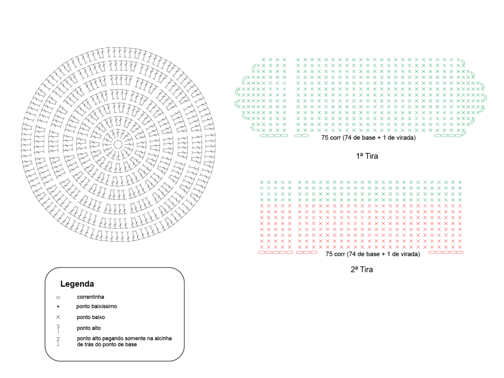 - Primeira tira: Utilize o fio Verde Água Escuro para fazer 75 correntes e siga o padrão gráfico por 13 carreiras. Dobre e costure esta tira na sexta carreira de um dos círculos, preenchendo com manta acrílica progressivamente.