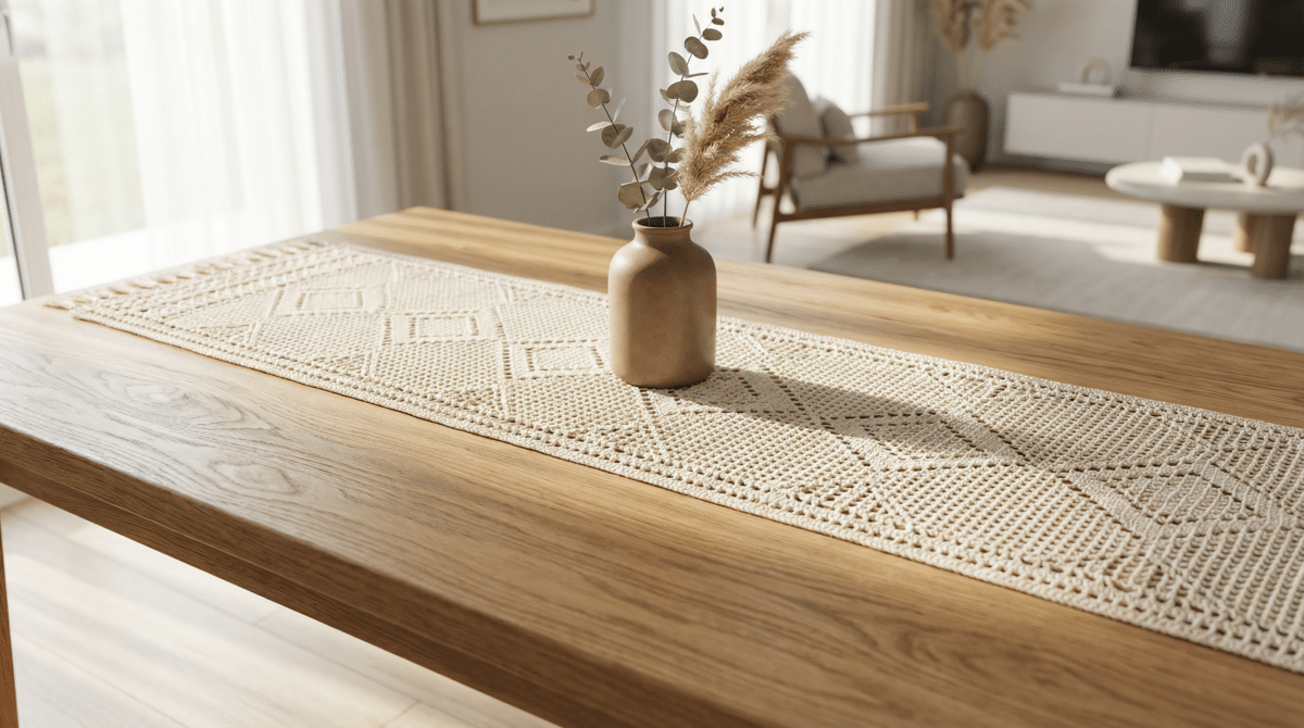 Para as casas que seguem o estilo Boho, os caminhos de mesa com franjas laterais ou macramê-crochê (uma fusão das duas técnicas) trazem o movimento e a descontração necessários. O segredo está em escolher peças com texturas tridimensionais que se destaquem sob a iluminação da sala de jantar.