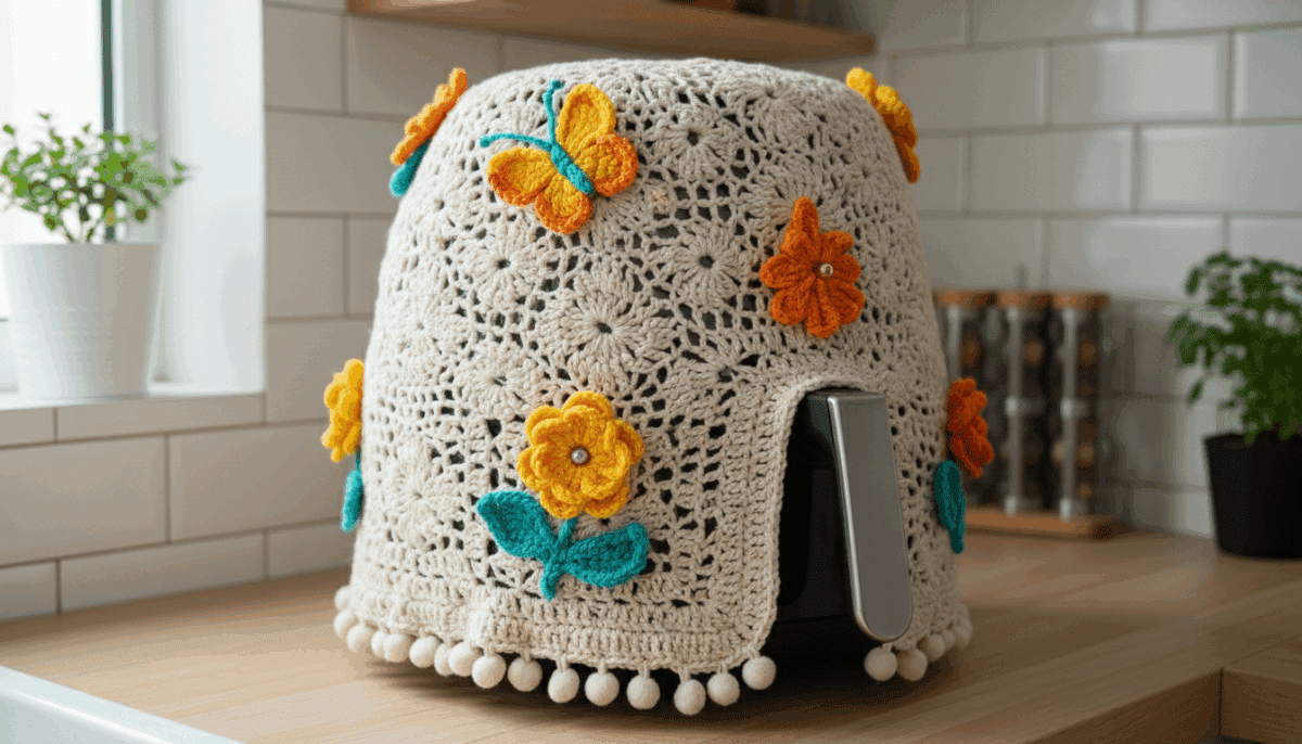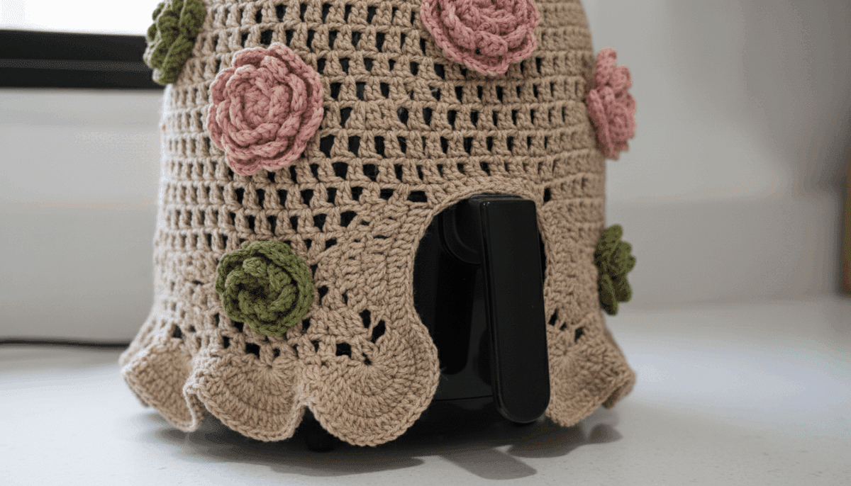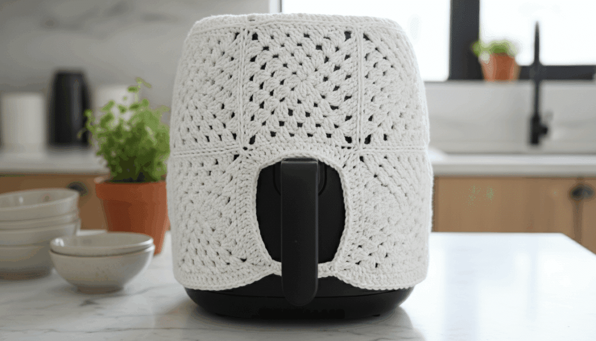 Se a sua fritadeira fica exposta na bancada, uma capa de air fryer em crochê protege contra poeira, deixa a cozinha charmosa e ainda valoriza o eletro. A peça é rápida, gasta pouco material e aceita inúmeras variações de pontos e cores.