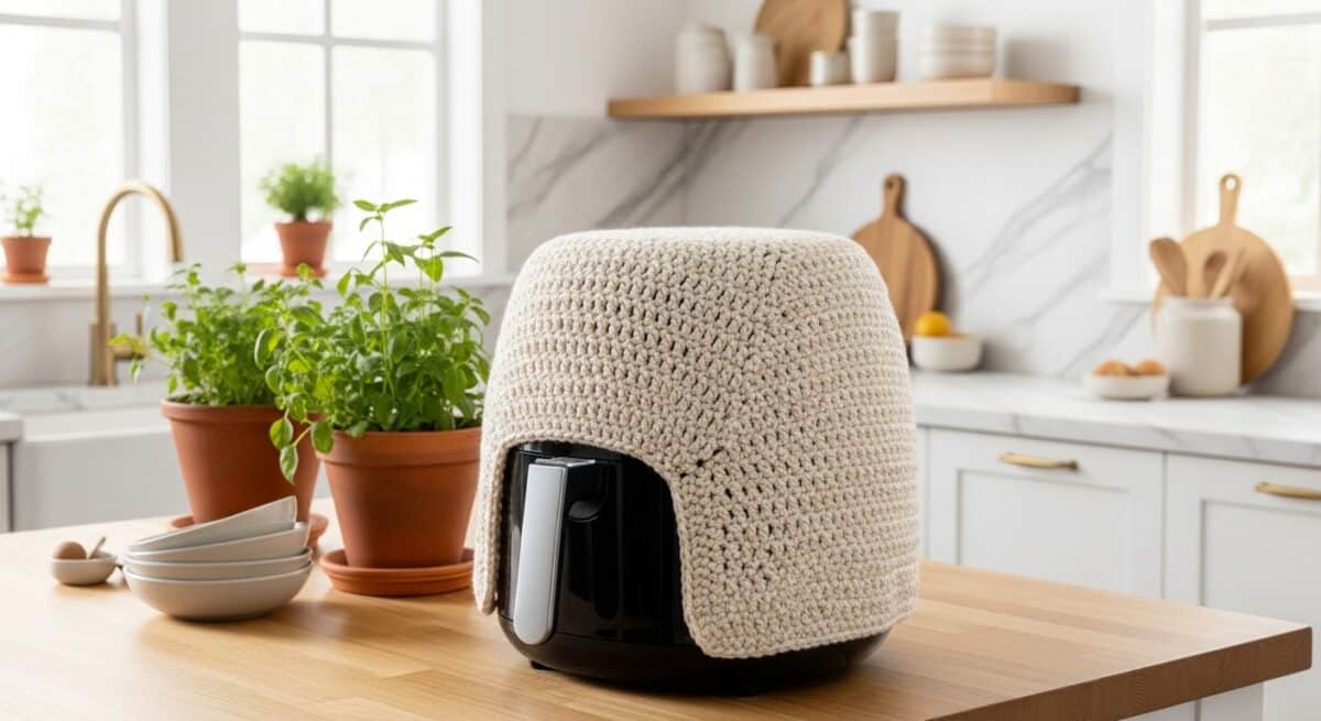 A capa de crochê para air fryer é aquele “truque de organização com charme”: esconde o fio, protege do pó e integra o eletro à decoração da cozinha. Diferente de uma toalhinha solta, ela abraça o formato do aparelho, cria volume bonito e mantém tudo no lugar. E já deixo claro o essencial: a capa é só para quando a air fryer estiver fria e desligada. Durante o uso, retire para não bloquear a ventilação nem reter calor.