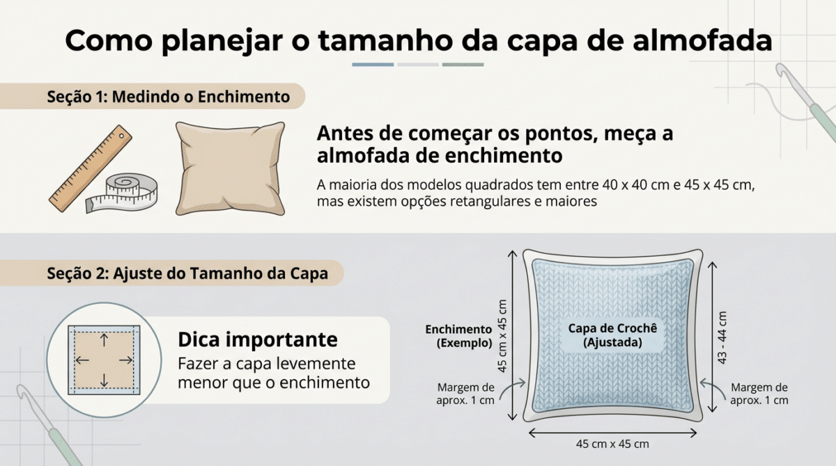 Antes de começar os pontos, meça a almofada de enchimento. A maioria dos modelos quadrados tem entre 40 x 40 cm e 45 x 45 cm, mas existem opções retangulares e maiores.