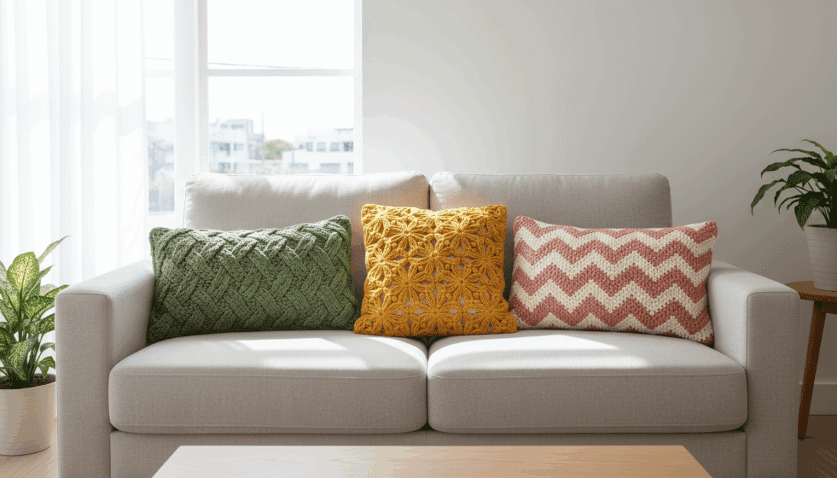 As capas de almofada em crochê moderno cabem em qualquer sala: dão volume tátil, aquecem os neutros e trazem artesanato verdadeiro para ambientes com base limpa. O visual 2026 privilegia paletas terrosas, neutros complexos e textura 3D pontual — nada de excesso. O segredo é combinar pontos simples com acabamentos impecáveis e uma escala correta para o enchimento.