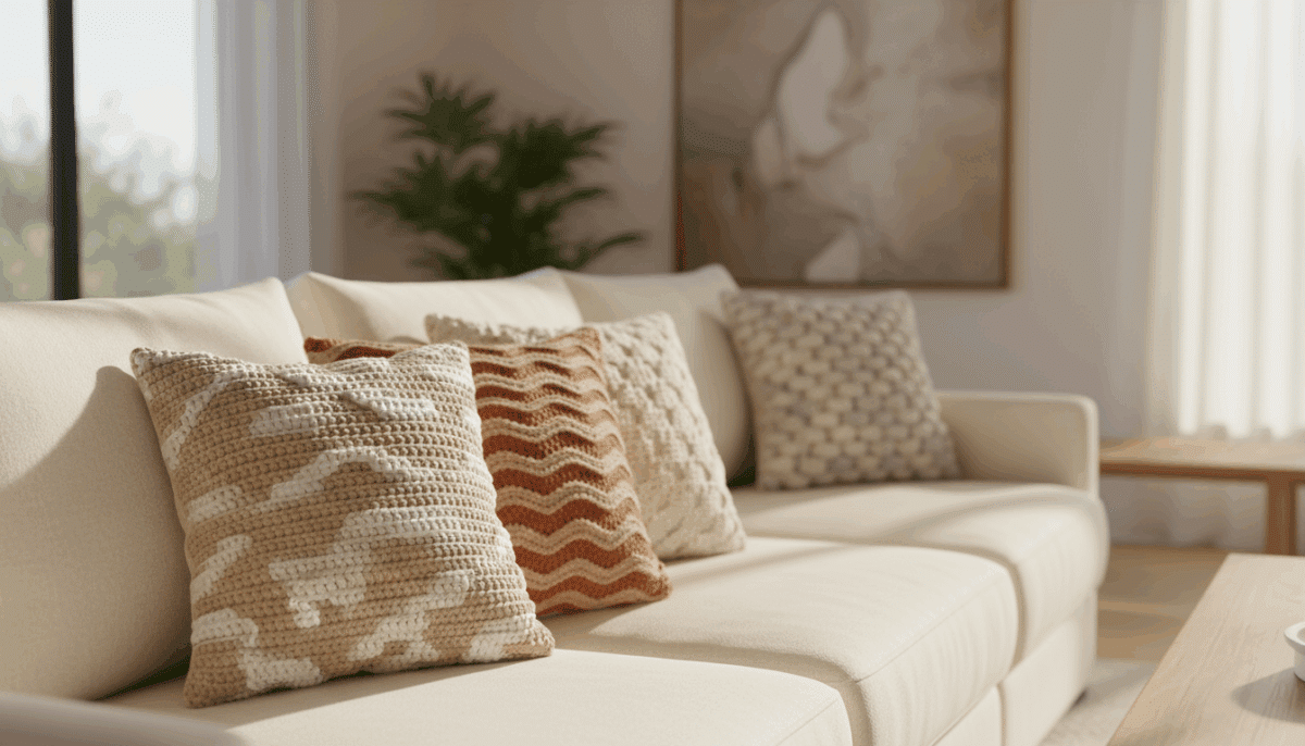 Alt sugerido para a imagem de destaque: “Capas de almofadas de crochê com texturas em sala neutra”