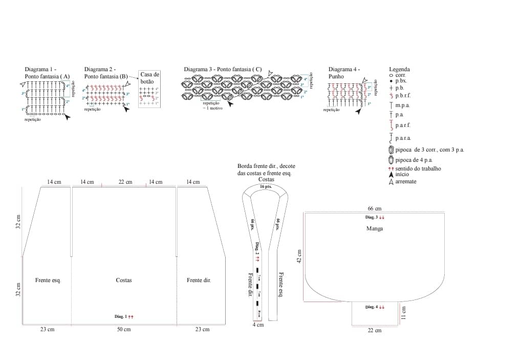 Pontos utilizados no crochê: corr.: correntinha, p.bx.: ponto baixíssimo, p.b.: ponto baixo, p.b.r.f.: p. baixo em relevo pegando pela frente do p. da carr. anterior, m.p.a.: meio ponto alto, p.a.: ponto alto, p.a.r.f.: p. alto em relevo pegando pela frente do p. da carr. anterior, p.a.r.a.: p. alto em relevo pegando por trás do p. da carr. anterior, pipoca de 3 corr. com 3 p.a.: 3 corr. (equivale a 1 p.), levantar 3 pts. altos, vire para o avesso e feche os 4 pts. com 1 p.bx., vire a peça para o dir.; pipoca de 4 p.a.: levantar 4 pts. altos, vire para o avesso e feche os 4 pts. com 1 p.bx., vire a peça para o dir.; fantasia (A): siga o diag. 1, p. fantasia (B): siga o diag. 2, fantasia (C): siga o diag. 3, punho: siga o diag. 4.