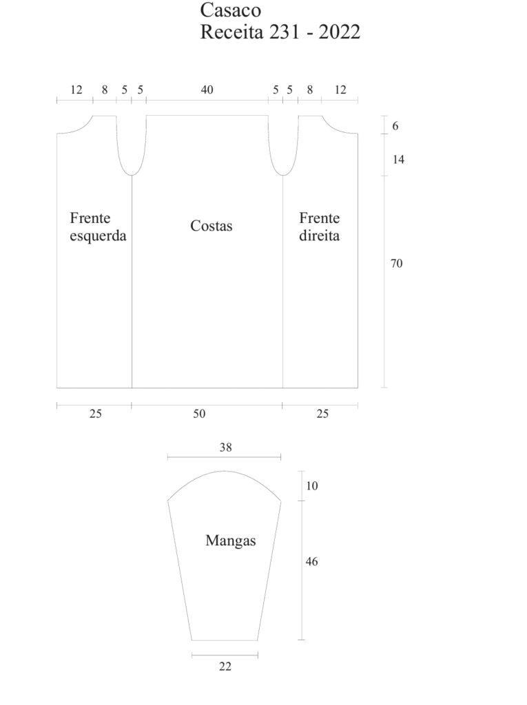 Mangas – Monte 41 p. nas ag. nº 4,0mm e tric. barra 1/1. A 3 cm do início do trabalho passe para as ag. nº 7,00mm e tric. em p. fantasia. Aum. de cada lado cada 8 carr.: 1 p. (10 v.). A 46 cm do início do trabalho para a cava rem. de cada lado cada 2 carr.: 2 p. (10 v.). A 56 cm do início do trabalho rem..
