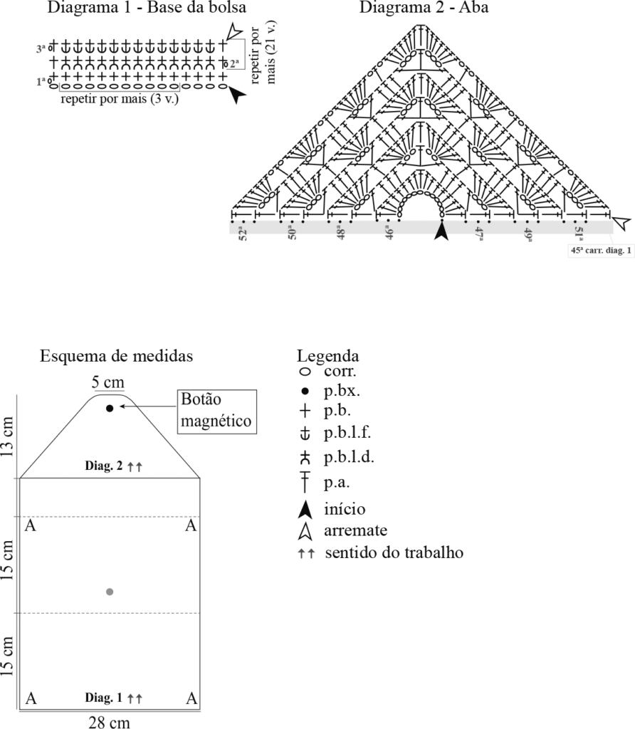 Pontos utilizados no crochê: corr.: correntinha, p.bx.: ponto baixíssimo, p.b.: ponto baixo, p.b.l.f.: p. baixo laç. a alça da frente da corr. formada pelo p. da carr. anterior, p.b.l.d.: p.b. laç. a alça detrás da corr. formada pelo p. da carr. anterior, p.a.: ponto alto, base da bolsa: siga o diag. 1, aba: siga o diag. 2.