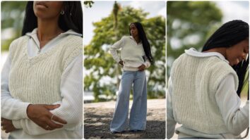 O colete de tricô Neve e Grafite está pronto para ser usado. Esta peça, além de prática, é uma excelente opção para aquecer e estilizar o visual em dias mais frios.