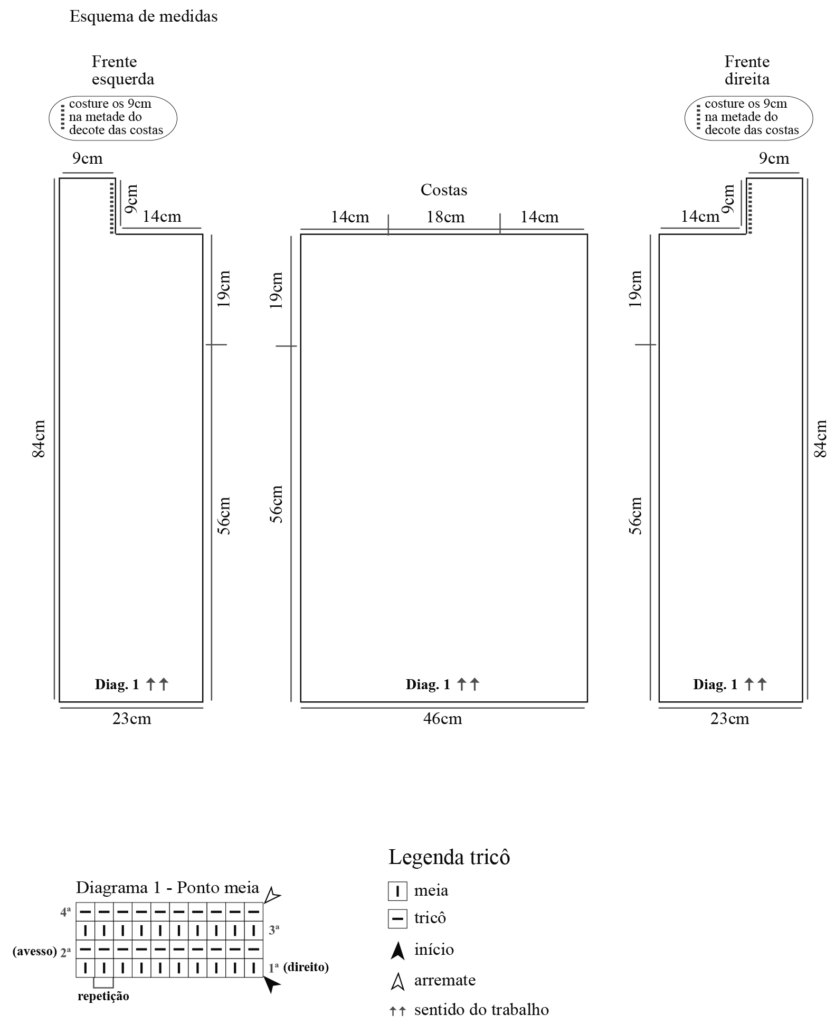 Abreviaturas: p.: ponto, pts.: pontos, rep.: repetição, m.: meia, t.: tricô, tric.: tricote, carr.: carreira, ag.: agulha, rem.: rematar, diag.: diagrama. Pontos utilizados: p. meia: siga o diag. 1 Amostra – Um quadrado de 10cm em p. meia na ag. de 5,0mm = 22 pts. x 28 carr.. Execução: Transfira os moldes para o papel vegetal para usar como referência na execução da peça. Observe as setas no esquema de medidas com a indicação do sentido do trabalho. Costas: Use o fio Majestoso na cor off white e monte 92 pts. na ag. de 5,0mm, inicie a peça pela barra e tric. a peça em p. meia acompanhando o diag. 1 e os pts. de rep.. À 75cm de comprimento desde o início rem. todos os pts. e reserve a peça. Frente direita: Use o fio Majestoso na cor off white e monte 46 pts. na ag. de 5,0mm, inicie a peça pela barra e tric. a peça em p. meia acompanhando o diag. 1 e os pts. de rep.. À 75cm de comprimento desde o início rem. do lado esquerdo o ombro 26 pts. e prossiga do lado direito peça sobre os 20 pts. em p. meia por mais (9cm – complemento para prender ao redor do decote das costas). À 84cm de comprimento desde o início rem. o fio. Frente esquerda: Igual a direita invertendo o lado do arremate do ombro. Montagem e acabamento: Use a ag. de tapeçaria e o fio Majestoso na cor off white e feche as laterais (56cm) deixando a abertura das cavas de (19cm). Feche os ombros (14cm) e costure os (9cm) complemento para prender ao redor do decote costas. Artesã: Samara Varella (1829)