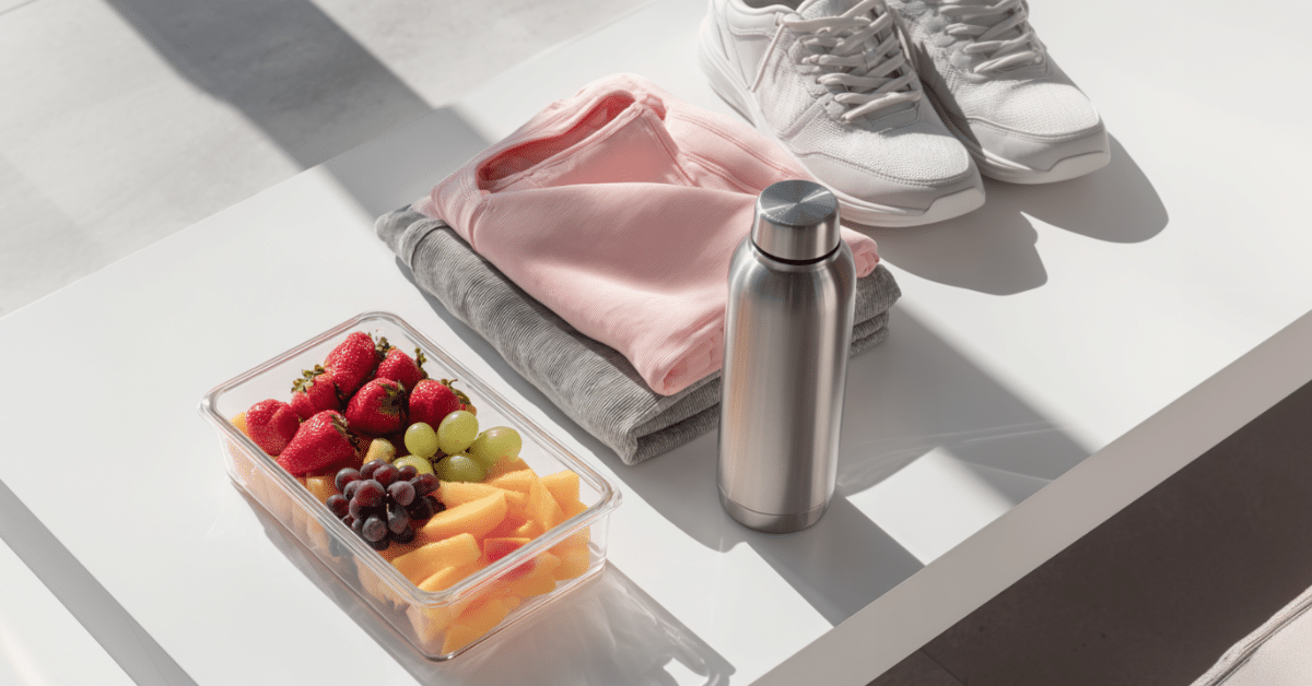 - Reduza o atrito: deixe tudo pronto e fácil — roupa de treino à mão, frutas cortadas, água visível.