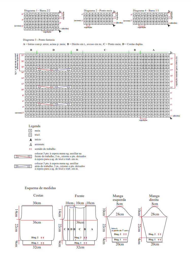 A manga direita segue o mesmo processo da esquerda, mas usando ponto meia conforme o diagrama 2. Depois de completar as mangas, una as partes e costure conforme descrito.