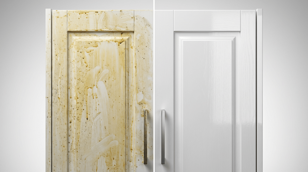 Remover a camada de gordura que se acumula nos armários superiores da cozinha é uma das tarefas mais frustrantes da limpeza doméstica. Esse resíduo, formado pela combinação de vapor, óleo de fritura e poeira, cria uma textura pegajosa que parece resistir aos produtos comuns de limpeza.