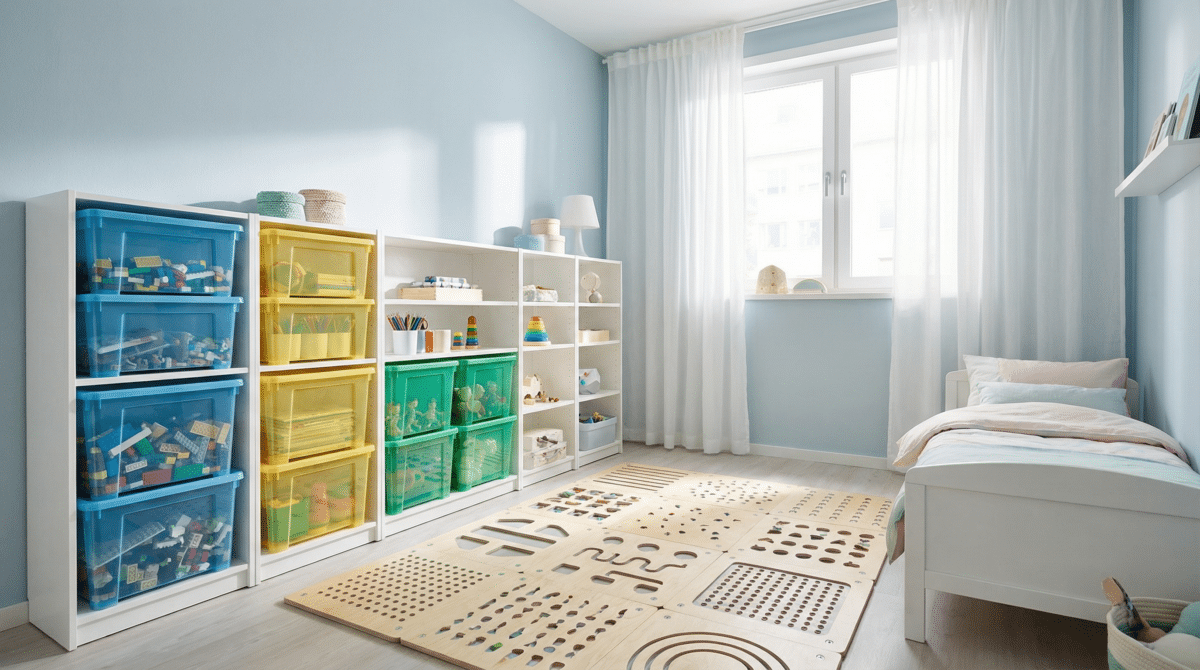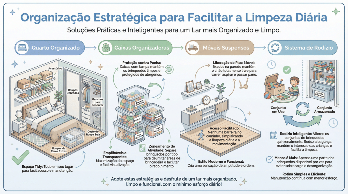 Móveis suspensos e prateleiras são excelentes aliados para manter o piso livre. Além disso, adotar o sistema de rodízio de brinquedos — onde apenas uma parte dos itens fica disponível para uso enquanto o restante é guardado — reduz a quantidade de objetos expostos à sujeira e mantém o interesse da criança renovado, facilitando a rotina de manutenção doméstica.