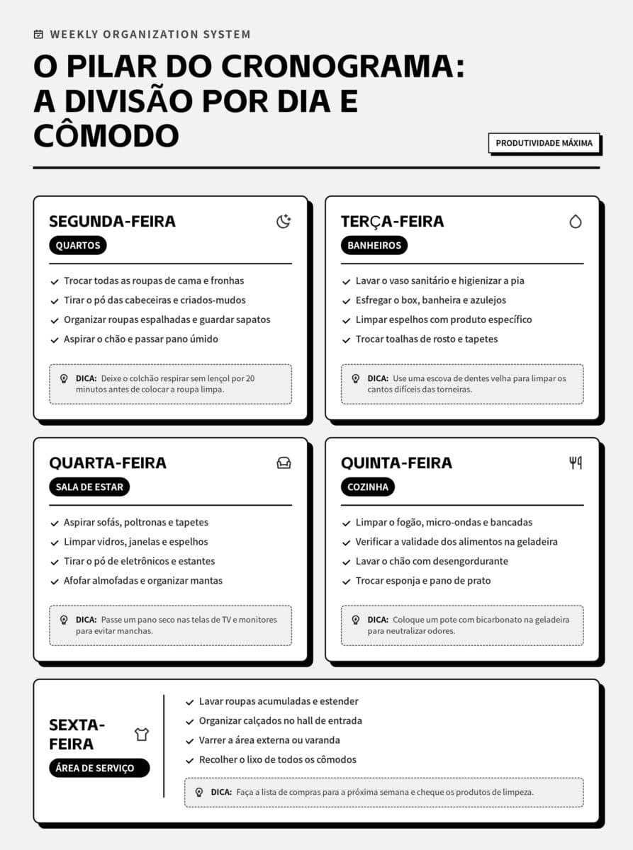 O pilar do cronograma: a divisão por dia e cômodo