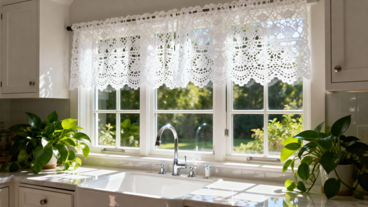 Além da beleza, as cortinas de crochê ajudam a filtrar a luz natural, criando um efeito suave e acolhedor — ideal para salas, cozinhas, quartos e até banheiros com janelas pequenas.