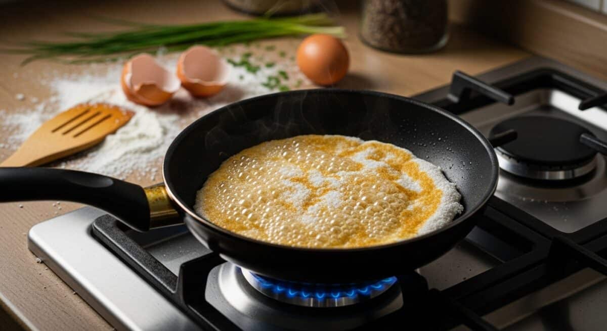 Aqueça uma frigideira antiaderente e despeje a massa. Não precisa de óleo, mas pode usar um fio se preferir.