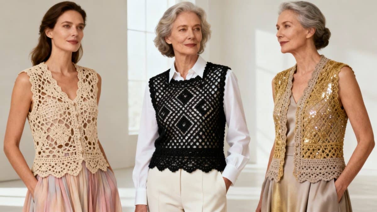 Coletes de crochê sofisticados são a peça-chave para quem quer unir técnica e elegância. O segredo está na tríade, gráfico bem construído, fio certo e acabamento disciplinado.