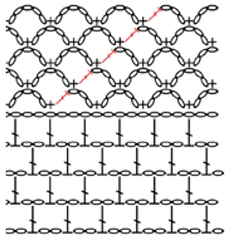 Siga o gráfico mudando para o ponto rede (observe a dica para a forma circular de execução do ponto no gráfico) e vá descendo até a altura do entre pernas. Então faça a junção com um ponto baixo (duas correntes, ponto baixo unindo com o outro lado, mais duas correntes e segue a carreira) exatamente no meio da peça.