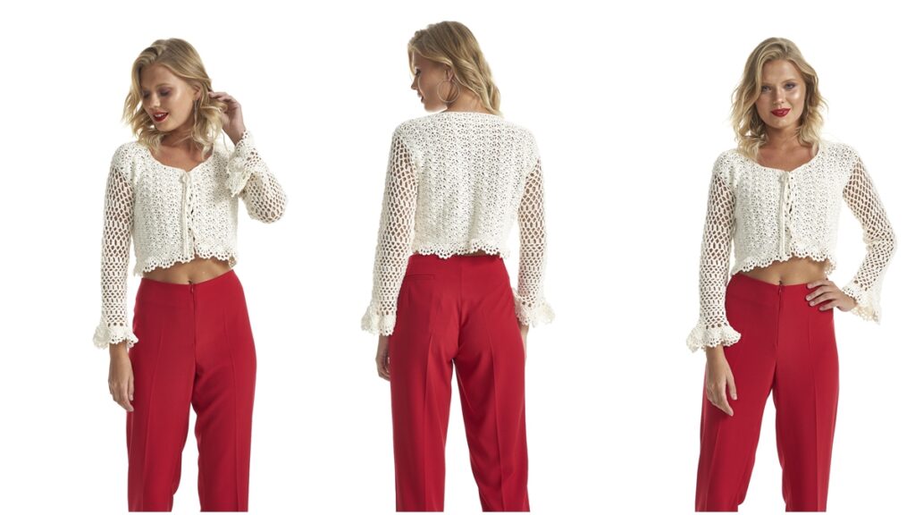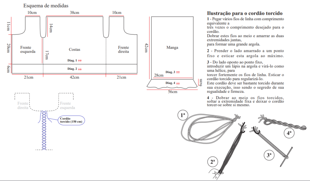 A montagem dos ombros e a adição das mangas, com atenção aos punhos elaborados no ponto fantasia do diagrama 4, são passos importantes na conclusão da peça. A finalização também inclui um bico de acabamento ao redor do decote e das frentes para acentuar o design do cropped.