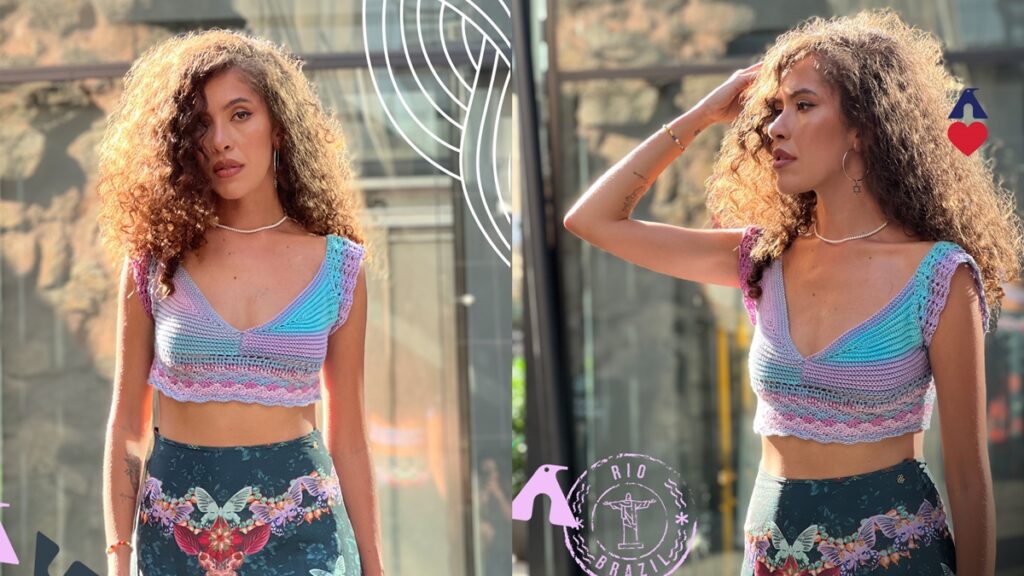 A tendência Mermaidcore é uma celebração ao mundo marinho, incorporando elementos que lembram sereias e seus habitats. As peças de crochê são ideais para traduzir essa estética devido à sua flexibilidade em criar padrões orgânicos e texturas semelhantes às do oceano. No caso do Cropped Sereia Carioca, o uso do fio Rio em nuances de azul intensifica visualmente essa conexão com o mar.