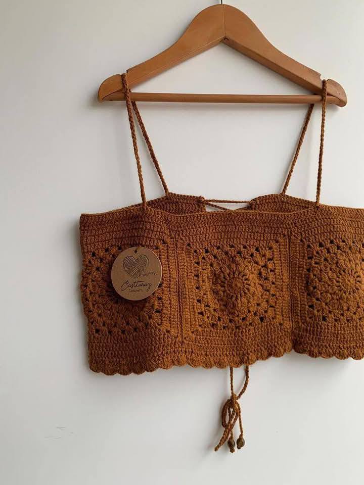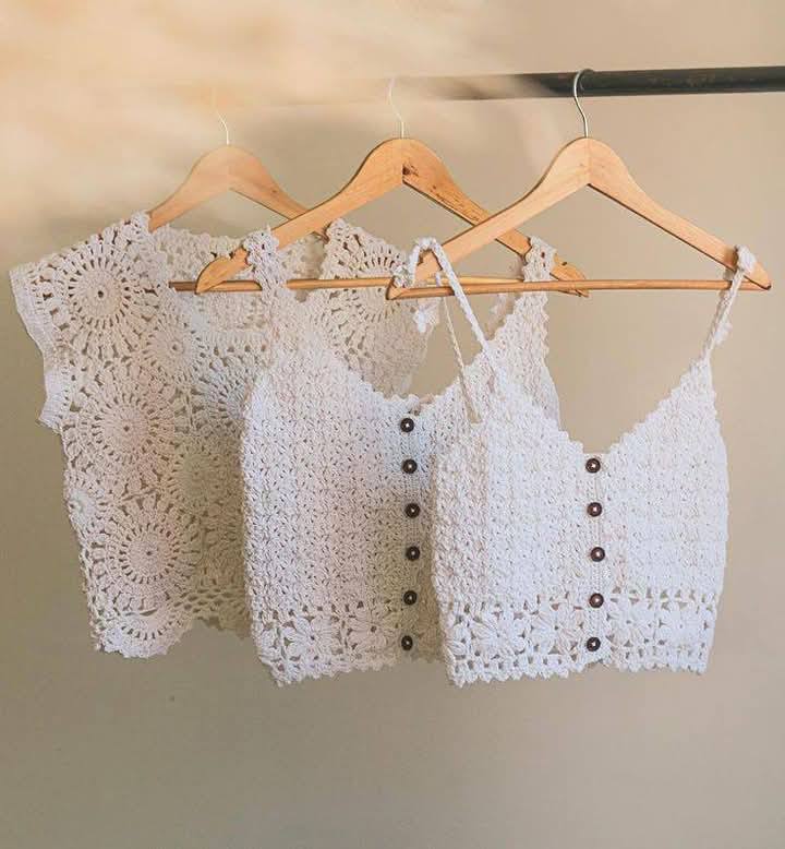 - Cropped em ponto rede – leve e moderno, feito apenas com correntinhas e pontos altos.