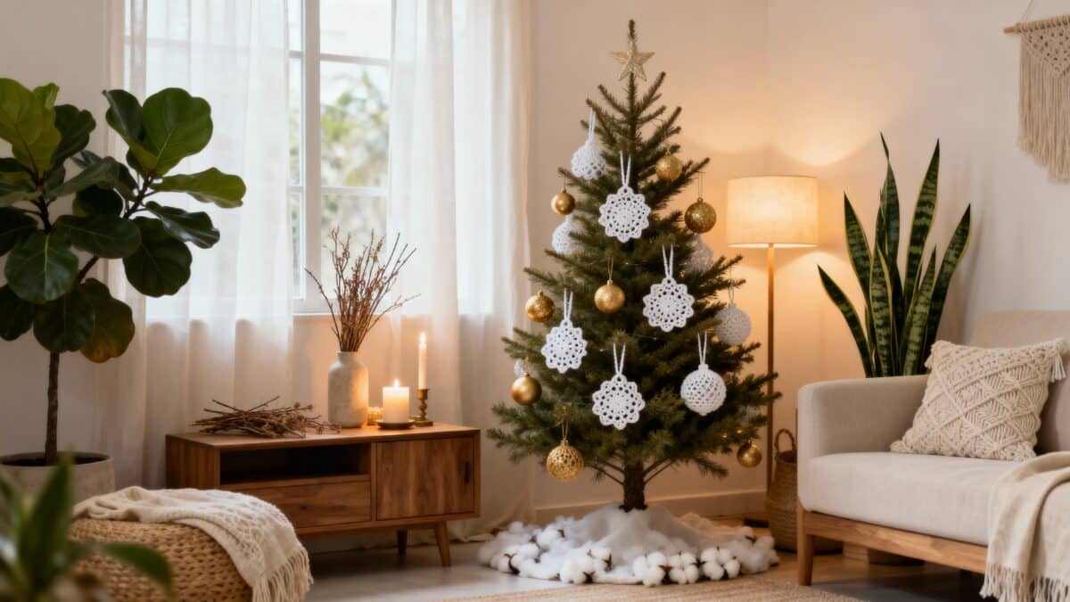 Os enfeites de crochê aparecem em novos formatos: flores, estrelas, corações e mini guirlandas, sempre com fios neutros e acabamento delicado.
