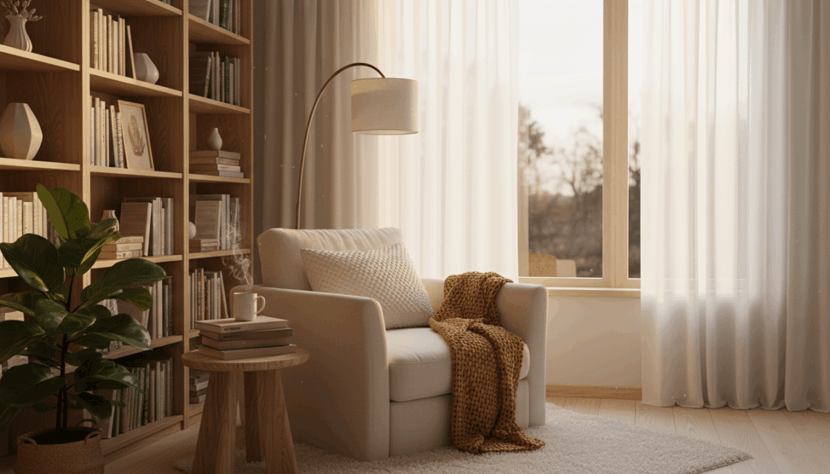 Já em um cantinho de leitura, livros ajudam a compor a atmosfera íntima e inspiradora.